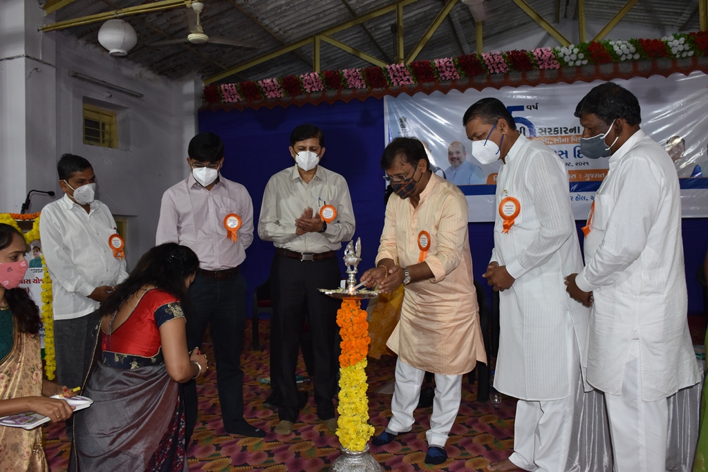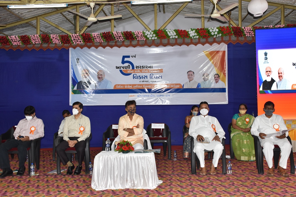 દંડકારણ્યની પાવન ભૂમિ ઉપર રહેતા છેવાડાના માનવીઓ સહીત રાજ્યભરના પ્રજાજનો પ્રત્યે અપાર સંવેદના સાથે કાર્યરત મુખ્યમંત્રી શ્રી વિજયભાઈ રૂપાણીના નેતૃત્વ હેઠળની સરકારની કામગીરીના લેખાજોખા કરવાનો આ અવસર છે, તેમ જણાવતા પ્રવાસન અને મત્સ્યોદ્યોગ મંત્રી શ્રી જવાહરભાઈ ચાવડાએ આહવા ખાતે, આ સરકારે વ્યક્તિના ગર્ભાધાનથી લઈને મરણોત્તર ક્રિયાઓ સુધી શ્રેણીબદ્ધ યોજનાઓ અમલી બનાવીને જનસમુદાય પ્રત્યે સાચી સંવેદના પ્રગટ કરી છે તેમ જણાવ્યુ હતુ. વિકાસના માપદંડનો ખ્યાલ આપતા મંત્રીશ્રી એ રાજ્યના દરેક વિસ્તાર, અને વ્યક્તિના વિકાસને નજર સમક્ષ રાખીને આ સરકાર રાતદિવસ ખડેપગે સેવા કરી રહી છે તેમ જણાવ્યુ હતું. ગુજરાતના દસે દિશાઓમા થઇ રહેલા વિકાસ મેપનો ખ્યાલ આપતા મંત્રીશ્રીએ પ્રજજનોના આશીર્વાદ સાથે ગુજરાત અને ગુજરાતના વિકાસને ઉત્તમ થી સર્વોત્તમ તરફ લઇ જવાની પ્રતિબદ્ધતા વ્યકત કરી હતી. ‘કોરોના કાળ’ મા જયારે વિશ્વ આખુ સ્તબ્ધ અને સ્થગિત થઇ ગયુ હતુ, ત્યારે પણ ગુજરાતે અડીખમ રહીને વિકાસની રફતારને રોકી નથી, તેમ મંત્રીશ્રીએ વધુમા જણાવ્યુ હતુ. સંવેદનશીલતા, પારદર્શિતા, પ્રગતિશીલતા, અને નિર્ણયાકતાના મુખ્ય ચાર આધાર સ્તંભો ઉપર કાર્યરત ગુજરાત સરકારે જનજનના વિકાસ માટે પરિશ્રમની પરાકાસ્ઠા સર્જી છે, તેમ તેમણે આ વેળા ઉમેર્યુ હતુ. વિકાસને વરેલા મુખ્યમંત્રી શ્રી વિજયભાઈ રૂપાણી સરકારના પાંચ વર્ષના જનકલ્યાણના કામોને પ્રજા સમક્ષ પેસ કરવાના સેવાયજ્ઞનો ખ્યાલ આપતા જિલ્લા પંચાયત પ્રમુખ શ્રી મંગળભાઈ ગાવિતે, વડાપ્રધાન શ્રી નરેન્દ્રભાઈ મોદીના ‘સૌના સાથ, સૌના વિકાસ’ની પરિકલ્પનાને વર્તમાન રાજ્ય સરકારે બખૂબી નિભાવી છે તેમ તેમના પ્રાસંગિક વક્તવ્યમા જણાવ્યું હતુ. છેવાડાના માનવીઓના વિકાસ માટે અનેકવિધ યોજનાઓ, પ્રોજેક્ટ્સનો અમલ કરીને ગુજરાતમા ચારેકોર વિકાસ થઇ રહ્યો છે તેમ જણાવતા શ્રી મંગલભાઈ ગાવિતે રાજ્ય, અને કેન્દ્ર સરકારના કાર્યક્રમો, યોજનાઓનો લાભ લેવા માટે જાગૃતિ કેળવવાનો અનુરોધ કર્યો હતો. જનપ્રતિનિધિઓ તથા અધિકારી, પદાધિકારીઓના સહયોગથી સાચા લાભાર્થીઓ સુધી યોજનાકીય લાભો પહોચાડવાની હિમાયત કરતા પ્રમુખશ્રીએ ડાંગ જિલ્લાના સર્વાંગીણ વિકાસથી જનતાને સંતોષ છે, તેમ જણાવી પ્રજા અને સરકાર વચ્ચે સુચારુ સુમેળ સધાયો છે તેમ ઉમેર્યું હતુ. ‘વિકાસ દિવસ’ અન્વયે ડાંગ જિલ્લાના કુલ ૩૪૪ લાભાર્થીઓને રૂ.૪૧૨.૮૦ લાખની કિમતના ‘પ્રધાનમંત્રી આવાસ યોજના (ગ્રામીણ)’ અંતર્ગત આવાસો એનાયત કરાયા હતા.જયારે અન્ય ૧૪૭૮ લાભાર્થીઓના કુલ રૂ.૪૪૩.૪૦ લાખના આવાસોના ખાતમુહુર્ત સાથે કુલ રૂ.૮૫૬.૨૦ લાખના કામો પ્રજાર્પણ કરીને ‘વિકાસ ઉત્સવ’ ઉજવાયો હતો. ‘વિકાસ દિવસ’ અંતર્ગત ડાંગ જિલ્લામા આહવા ખાતે નવિન બી.એસ.૬ એનીમેશન નોમ્સ ધરાવતી 