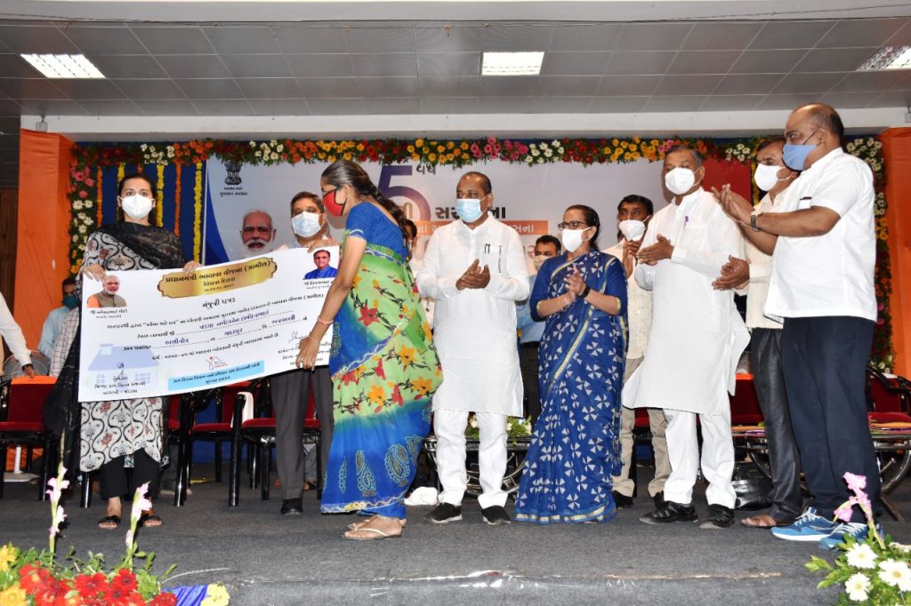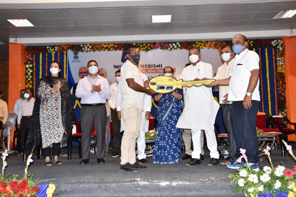 તેમણે વધુ ઉમેરતા જણાવાયું કે, આદિજાતી વિસ્તાર કે અન્ય વિસ્તારને રસ્તાઓ,પુલો, રેલ્વે ફાટક માટેના ઓવરબ્રીજ,દરેક નાના ફળિયાઓમાં રસ્તાઓ, ફોરલેન પુરા પાડવામાં આવ્યા છે. આવી સુખાકારી વ્યવસ્થા પ્રજાને મળી છે. નર્મદા યોજનાથી છેવાડાના ગામડા સુધી પાણી, સુજલામ સુફલામ યોજના, વનબંધુ યોજના, જળાશયોની યોજનાઓ હેઠળ અનેક લોકોને આવરી લેવાયા છે.ટપક પદ્ધતિથી પૂરતું પાણી મળે તે ક્ષેત્રે સરકાર કામો કરી રહી છે. રૂ.૨૧.૭૬૧ કરોડના ખર્ચે “નલ સે જલ” યોજના હેઠળ ૧૮ હજાર ગામડાઓના લોકોને શુદ્ધ પાણી આપવાની વ્યવસ્થાની કામગીરી પણ સરકાર આપી રહી છે. આ સરકાર વિકાસની યાત્રા અવિરત ચાલુ રાખશે. આ પ્રસંગે જીલ્લા કલેકટરશ્રી નરેન્દ્રકુમાર મીના, જીલ્લા વિકાસ અધિકારીશ્રી શ્વેતા તેવટિયા, જીલ્લા સંગઠન પ્રભારી શ્રીમતી જયશ્રીબેન, જીલ્લા ગ્રામ વિકાસ અધિકારીશ્રી બી.ડી.ડાવેરા, મામલતદારશ્રી ગઢવી, શ્રી ભીખાજી ઠાકોર, અધિકારીશ્રીઓ તથા આવાસ યોજનાના લાભાર્થીઓ ઉપસ્થિત રહ્યા હતા.