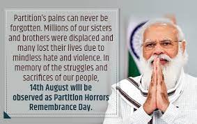 પ્રધાનમંત્રી શ્રી નરેન્દ્ર મોદીએ કહ્યું કે આપણા લોકોના સંઘર્ષ અને બલિદાનની યાદમાં 14મી ઓગસ્ટને વિભાજન વિભીષિકા સ્મૃતિ દિવસ તરીકે મનાવવામાં આવશે. શ્રેણીબદ્ધ ટ્વીટમાં પ્રધાનમંત્રીએ કહ્યું; દેશના ભાગલાની પીડા ક્યારેય ભૂલી શકાય તેમ નથી. નફરત અને હિંસાને કારણે, આપણી લાખો બહેનો અને ભાઈઓ વિસ્થાપિત થયા અને જીવ પણ ગુમાવ્યા. તે લોકોના સંઘર્ષ અને બલિદાનની યાદમાં 14 મી ઓગસ્ટને ‘વિભિષિકા સ્મારક દિવસ’ તરીકે ઉજવવાનું નક્કી કરવામાં આવ્યું છે. #PartitionHorrorsRemembranceDay નો આ દિવસ આપણને ભેદભાવ, દુશ્મનાવટ અને દુરાગ્રહના ઝેરને દૂર કરવા માટે પ્રેરણા તો આપશે જ, પરંતુ તે એકતા, સામાજિક સમરસતા અને માનવીય સંવેદનાઓને પણ મજબૂત બનાવશે.