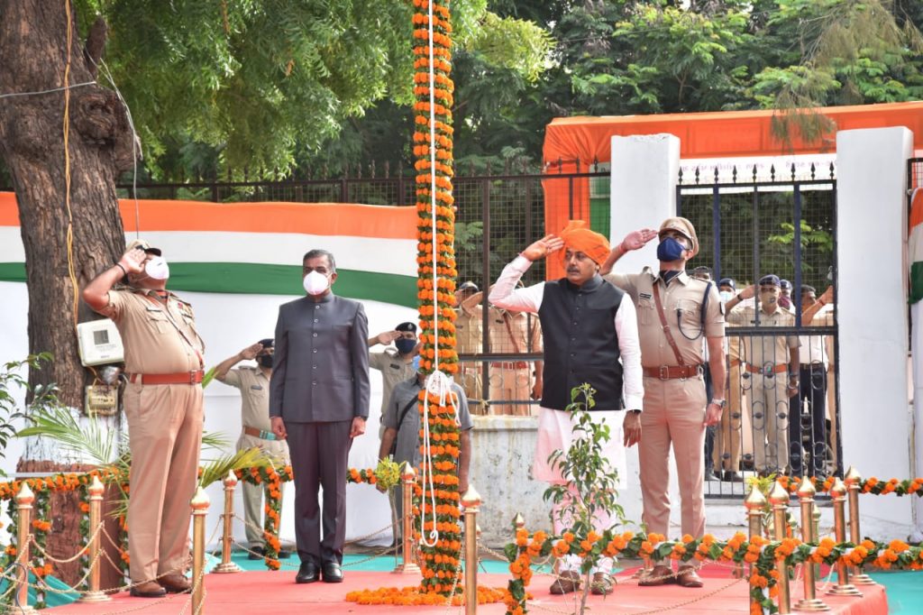 કોરોના મહામારી વચ્ચે રાજ્ય સરકાર દ્વારા અપાયેલ ગાઇડલાઇન મુજબ સ્વાતંત્ર્ય પર્વની ઉજવણીમાં આન બાન અને શાન સાથે રાજય કક્ષાના અન્ન નાગરિક પુરવઠા મંત્રીશ્રી ધમેન્દ્રસિંહ જાડેજાના વરદ્દ હસ્તે તીરંગો ફરકાવ્યા બાદ જિલ્લા કલેકટરશ્રી જે.બી. પટેલ અને જિલ્લા પોલીસ વડાશ્રી એસ.આર.ઓડેદરાની આગેવાની હેઠળ ખુલ્લી જીપમાં પોલીસ જવાનોની પરેડનું નિરીક્ષણ કરી સિમિત સંખ્યામાં ઉપસ્થિતોનું અભિવાદન ઝીલ્યું હતું.