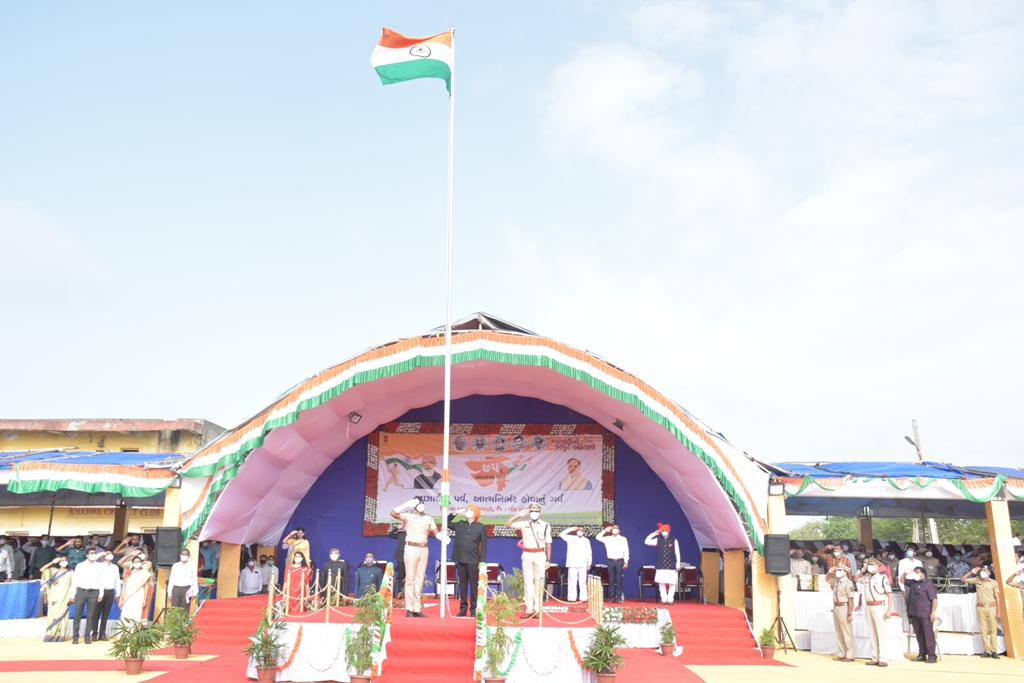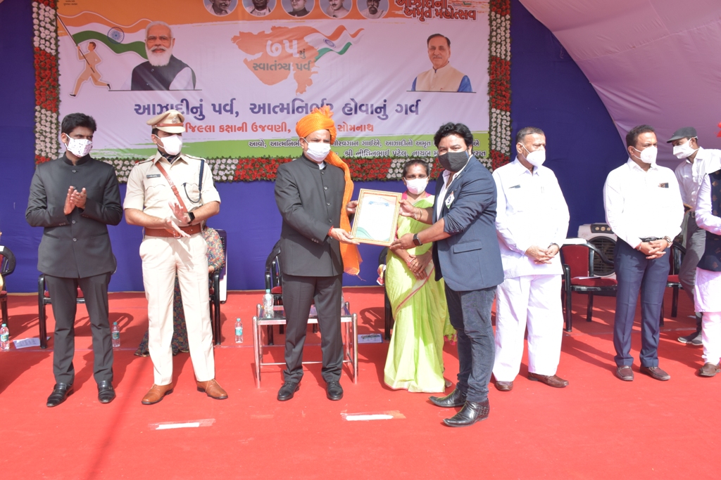 આ પ્રસંગે કલેકટરશ્રીએ આજના રાષ્ટ્રીય પર્વ નિમિતે ગીર સોમનાથ જિલ્લા વાસીઓને શુભકામના પાઠવી હતી. આજનો દિવસ દેશ પ્રેમનો દિવસ છે. ભારત માતાને કોટી કોટી વંદન કરીને કલેકટરશ્રીએ દેશની આઝાદી માટે યોગદાન અને બલિદાન આપનાર સૈાને વંદન કરી ગુજરાતનાં સપુત વિશ્વ વિભૂતિ મહાત્મા ગાંધી અને અખંડ ભારતનાં શિલ્પી શ્રી સરદાર વલ્લભભાઇ પટેલનું જીવન આપણને પ્રેરણા આપે છે. આ પ્રસંગે મહાનુભાવોના હસ્તે કોરોના વાયરસની મહામારીમા જીવના જોખમે ફરજ બજાવનાર આરોગ્ય વિભાગના તબીબો, કર્મચારીઓ અને પોલીસ વિભાગના જવાનો અને વહીવટી તંત્રના કર્મયોગી કોરોના વોરિર્યસને સન્માન પત્ર એનાયત કરી બહુમાન કરાયું હતું તેમજ વૃક્ષારોપણ કર્યું હતું. સરકારશ્રીની કોવિડ-૧૯ની ગાઈડ લાઈન મુબજ ગીર સોમનાથ જિલ્લામાં રાષ્ટ્રીય પર્વની ઉજવણી કરવામાં આવી હતી.