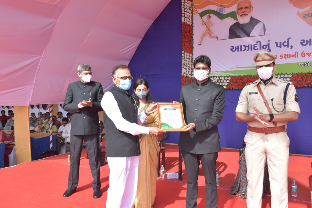 કલેકટરશ્રી રાજેદવસિંહ ગોહીલ હસ્તે ધ્વજવંદન મહાનુભાવોનાં હસ્તે કોરોના વોરિર્યસનું સન્માન કરાયુ