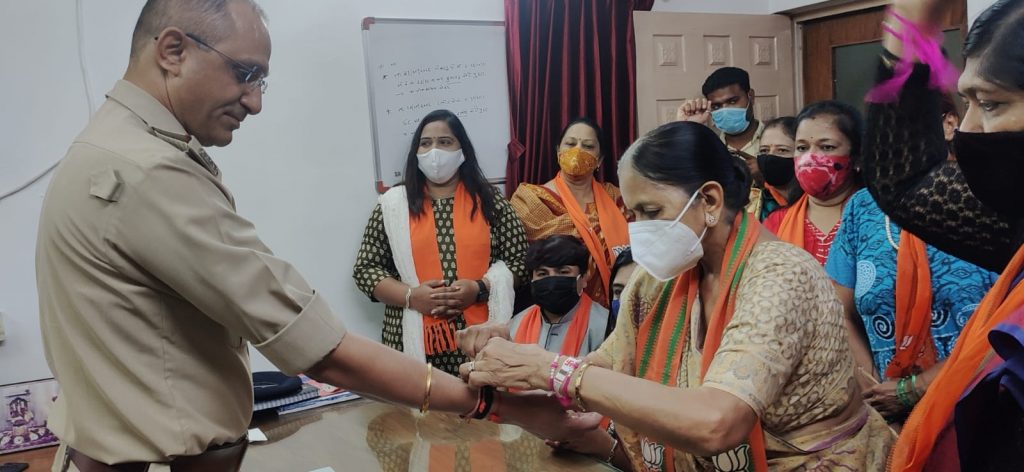 મહેસાણા A ડિવિઝન પોલીસ સ્ટેશનમાં પણ PI શ્રી જે. એસ. પટેલ અને તેમના પોલીસ સ્ટેશનના કર્મચારીઓ ને પણ રાખડી બાંધી કોરોના કાળ માં પોલીસ વિભાગ દ્વારા કરવામાં આવેલી સેવા બદલ તેમનો આભાર માન્યો. PI શ્રી જે. એસ. પટેલ અને તેમના સ્ટાફ દ્વારા મહેસાણા ની બહેનો ની સુરક્ષા ની ખાતરી આપવામાં આવી. માનનીય સાંસદ શ્રી અને સમગ્ર મહિલા મોરચા ની ટીમ દ્વારા શહેરના સફાઈ કર્મચારીઓ ને પણ રાખડી બાંધી તેમની સેવાઓ બદલ તેમનો આભાર માન્યો. વડનગર GMERS મેડિકલ કોલેજના નર્સિંગ સ્ટાફ ને પણ રાખડી બાંધવામાં આવી અને કોરોના કાળ માં તેમની સેવાઓ બદલ આભાર માન્યો.