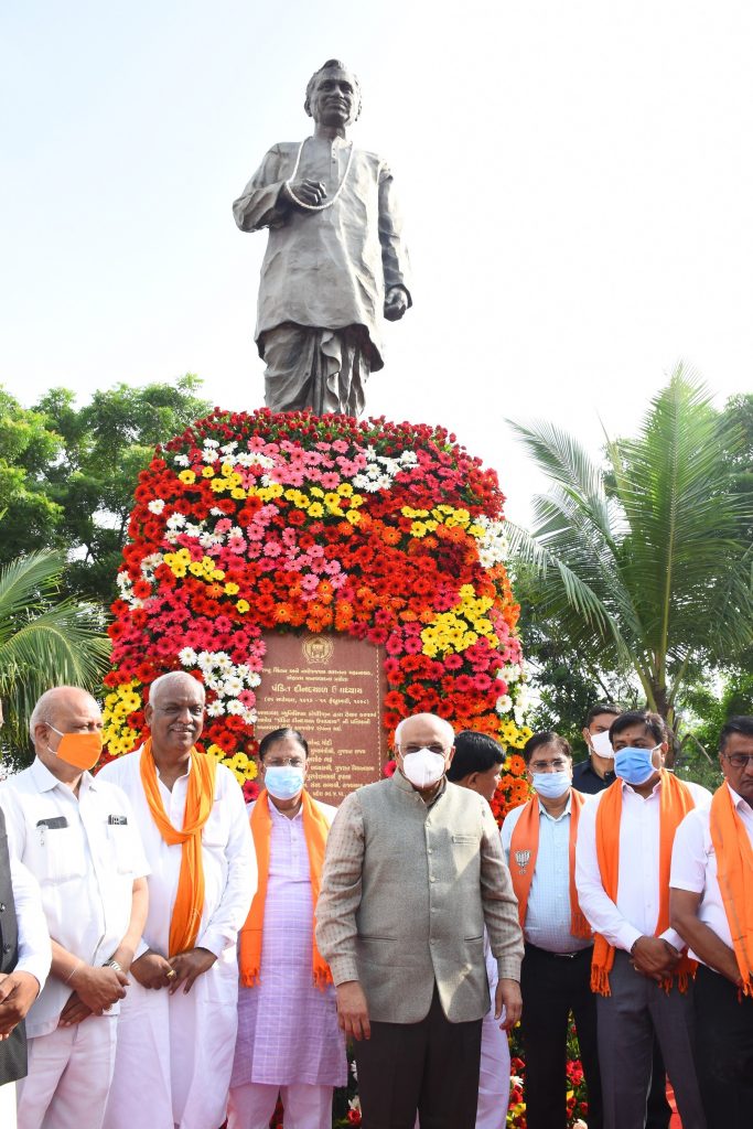 એકાત્મ માનવ વાદના પ્રણેતા પંડિત દીનદયાળજીની જન્મ જયંતિએ મુખ્યમંત્રી શ્રી ભુપેન્દ્રભાઈ પટેલે ભાવસભર અંજલિ આપી હતી. મુખ્યમંત્રીશ્રીએ આજે અમદાવાદમાં મણિનગર ખાતે પંડિત દિનદયાળજીની પ્રતિમાને શ્રદ્ધાસુમન અર્પણ કર્યા હતા. આ અવસરે અમદાવાદના મેયર શ્રી કિરીટભાઈ પરમાર મણિનગરના ધારાસભ્ય શ્રી સુરેશભાઈ પટેલ અમદાવાદ મહાનગરપાલિકાની સ્ટેન્ડીંગ કમિટીના ચેરમેન શ્રી હિતેશ બારોટ, શહેર ભાજપ પ્રમુખ શ્રી અમિતભાઇ શાહ મ્યુનીસીપલ કાઉન્સિલરો અગ્રણીઓ વગેરે ઉપસ્થિત રહ્યા હતા.