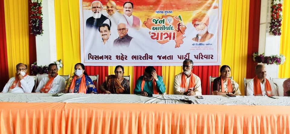 તારીખ:- 01/10/2021 ના રોજ મહેસાણા જિલ્લા ખાતે જન આશિર્વાદ યાત્રા અંતર્ગત ગુજરાત રાજ્યના માન. રાજ્યકક્ષાના મંત્રી શ્રી કીર્તિસિંહ વાઘેલા જીને. વિજાપુર અને વિસનગર તાલુકા ખાતે સ્વાગત સમારોહ કાર્યક્રમ યોજાયો હતો, ત્યારબાદ ત્યાં થી આગળ વધતા આપડા લોકલાડીલા માન. વડાપ્રધાન શ્રી નરેન્દ્રભાઈ મોદી સાહેબ ના મૂળ વતન એટલે કે વડનગર,વડનગર ખાતે આવેલ હાટકેશ્વર મહાદેવ ના દર્શન કરી,વડનગર રેલવે સ્ટેશન ની મુલાકાત કરી સાથે શ્રીમતી શારદાબેન એ. પટેલ (સાંસદ શ્રી)શ્રી જસુભાઈ પટેલ (ભાજપ પ્રમુખ મહેસાણા જિલ્લા) અને ભાજપ ના આગેવાન શ્રીઓ અને કાર્યકરો સાથે ચાય પે ચર્ચા કરી હતી.