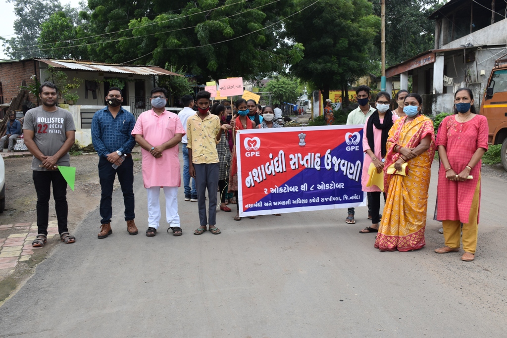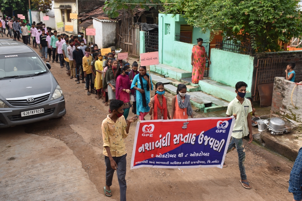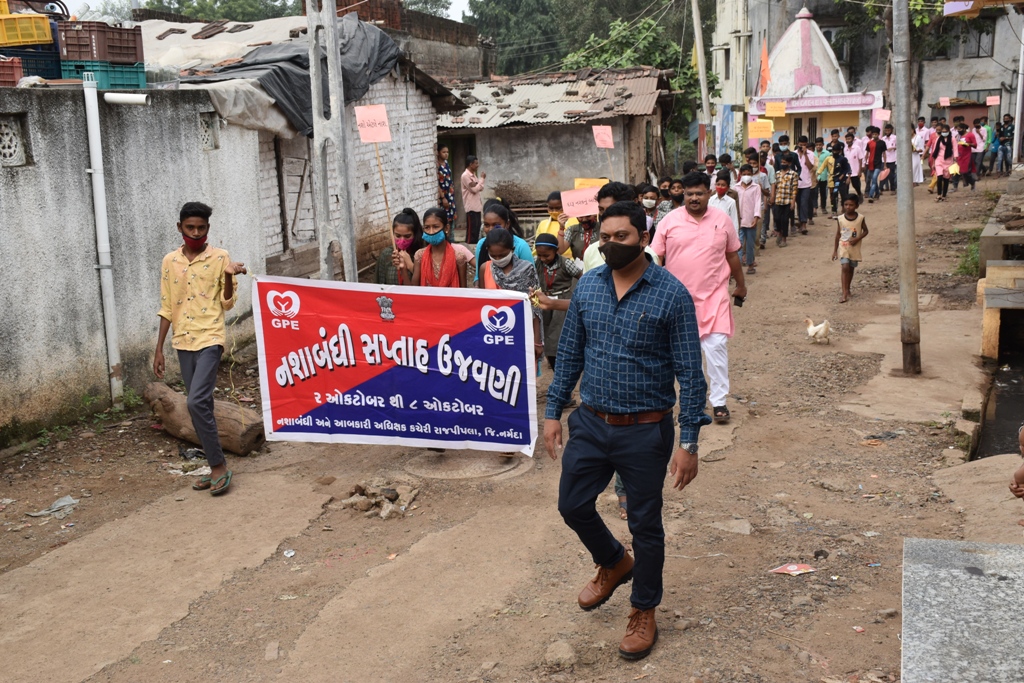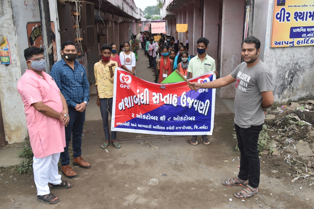 રાષ્ટ્રપિતા પૂ. મહાત્મા ગાંધીની જન્મ જયંતિ નિમિત્તે તા.૨ જી થી તા.૮ મી ઓક્ટોબર,૨૦૨૧ દરમિયાન હાથ ધરાયેલી નશાબંધી સપ્તાહની રાજ્યવ્યાપી ઉજવણીના ભાગરૂપે નર્મદા જિલ્લા વહિવટીતંત્ર ધ્વારા જિલ્લાની નશાબંધી અને આબકારી અધિકારીશ્રીની કચેરીના માધ્યમથી આજે સવારે રાજપીપલામાં વીર શ્યામજી કૃષ્ણવર્મા પ્રાથમિક શાળા નં-૪ ખાતેથી નર્મદા જિલ્લા કાનૂની સેવા સત્તા મંડળના સુપ્રિટેન્ડન્ટશ્રી જયદિપભાઇ સાદડીયા અને જિલ્લા નશાબંધી સબ ઇન્સપેક્ટરશ્રી એસ.ડી.વસાવાએ વ્યસનમુક્તિ પ્રભાતફેરીને લીલીઝંડી ફરકાવીને પ્રસ્થાન કરાવ્યું હતું.