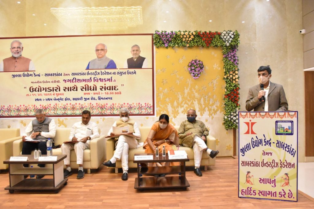 સાબરકાંઠા જિલ્લા ઉધોગ કેન્દ્ર, સાબરકાંઠા તેમજ સાબરકાંઠા ઇન્ડસ્ટ્રીઝ ફેડરેશનના સંયુક્ત ઉપક્રમે “ઉધોગકારો સાથે સીધો સંવાદ” કાર્યક્ર્મ સહકાર રાજ્યમંત્રીશ્રી જગદીશભાઇ વિશ્વકર્માના અધ્યક્ષસ્થાને હિંમતનગર ખાતે યોજાયો. જેમાં ઉધોગકારોને પડતી મુશ્કેલીઓ અને પશ્નોના નીરાકરણ માટે મંત્રીશ્રી દ્રારા ઉધોગકારોને માર્ગદર્શન અને સારી અને સુદ્રઢ સુવિધા આપી શકાય તે માટે સીધો સંવાદ કરવામાં આવ્યો હતો.આ પ્રસંગે મંત્રીશ્રીએ જણાવ્યું હતું કે, વડાપ્રધાનશ્રી નરેન્દ્રભાઇ મોદીએ વિકાસની રાજનીતી કરી છે. આ વિકાસની ગતીને ગુજરાતના મુખ્યમંત્રીશ્રી ભૂપેન્દ્રભાઇ પટેલે આગળ ધપાવી છે. વડાપ્રધાનશ્રીના આત્મનિર્ભર ભારતના સ્વપ્નને આગળ વધારવા માટે ઉધોગકારો આગળ આવે તેઓ રોજગારીનું નિર્માણ કરે છે. આ રોજગાર નિર્માતાઓના પ્રશ્નો તાત્કાલિક ધોરણે ઉકેલવામાં આવશે. ઉધોગકારો પીન થી લઈને પ્લેન સુધી ગુજરાતમાં બનાવી રહ્યા છે. બાવળા પાસે આઇક્રિએટ સ્ટાર્ટ-અપ થકી ગુજરાતના યુવાનોને તેમના ક્રિએટીવ અને નવા આઇડીયાને પ્લેટફોર્મ પુરૂ પાડવામાં આવ્યું છે.
