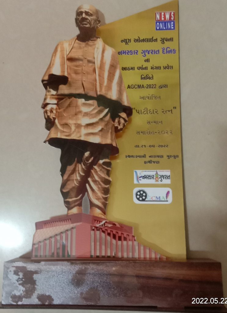 ન્યૂઝ ઑન લાઈન ગ્રુપ ના નમસ્કાર ગુજરાત દૈનિક ના આઠમા વર્ષ ના મંગલ પ્રવેશ નિમિતે AGCMA – ૨૦૨૨ દ્વારા આયોજિત “પાટીદાર રત્ન” સમ્માન સમારોહ – ૨૦૨૨ તારીખ ૨૧ મે ૨૦૨૨ ના રોજ સાંજે ૭ વાગ્યે સ્વામિ નારાયણ ગુરુકુળ હાથીજણ અમદાવાદ ખાતે કાર્યક્રમ યોજાયો હતો જેમાં સ્વામી નારાયણ મહંત અને ગૌ શાળા દેકાવાડા ના મહંત, અને પાટીદારો મોટી સંખ્યામાં ઉપસ્થિત રહ્યા હતા આ કાર્યક્રમ માં ગાંધીનગર ના હિન્દી ગુજરાતી કવિ લેખક અને અનુવાદક, સામાજિક કાર્યકર, પ્રમુખ ગાંધી નગર સાહિત્ય સેવા સંસ્થાન ચેરીટ્રે બલ ટ્રસ્ટ ગાંધીનગર ના ડૉ ગુલાબચંદ પટેલ ને સાહિત્ય ક્ષેત્રે મેળવેલ સિધ્ધિઓ હેતુ “પાટીદાર રત્ન એવોર્ડ – ૨૦૨૨ ન્યૂઝ ઑન લાઈન ના તંત્રી ડૉ કલ્પેશ ભાઇ પટેલ દ્વારા એનાયત કરવામાં આવ્યો છે. આ કાર્યક્રમ માં કુલ મળીને ૧૮૦ જેટલા અવૉર્ડ વિભિન્ન ક્ષેત્રે વિશિષ્ટ લાયકાત ધરાવતા લોકો ને આ અવૉર્ડ દ્વારા સન્માનિત કરવામાં આવ્યા હતા. આ કાર્યક્રમ માં ગાંધી નગર સાહિત્ય સેવા સંસ્થાન ચેરીટ્રે બલ ટ્રસ્ટ ના ટ્રસ્ટીઓ મહેન્દ્ર ભાઇ ચૌહાણ ઉપસ્થિત રહ્યા હતા અને ડૉ ગુલાબચંદ પટેલ ને અભિનંદન પાઠવ્યા હતા. ડૉ ગુલાબચંદ પટેલ ને સાહિત્ય ક્ષેત્રે ૪૦૦ થી વધુ અને સામાજિક કાર્યકર તરીકે એકસો થી વધુ રાષ્ટ્રીય અને આંતરરાષ્ટ્રીય સ્તરે સન્માન પ્રાપ્ત થયા છે. આ કાર્યક્રમ માં સુરત ની કુમારી કેસર દ્વારા સુંદર ગીત રજૂ કરવામાં આવ્યું હતું ડૉ ગુલાબચંદ પટેલ ને ખંભોળજ સાહિત્ય સંસ્થા ના અધ્યક્ષ શ્રી શૈલેષ વાણિયા દ્વારા ખૂબ ખૂબ અભિનંદન પાઠવ્યા છે.