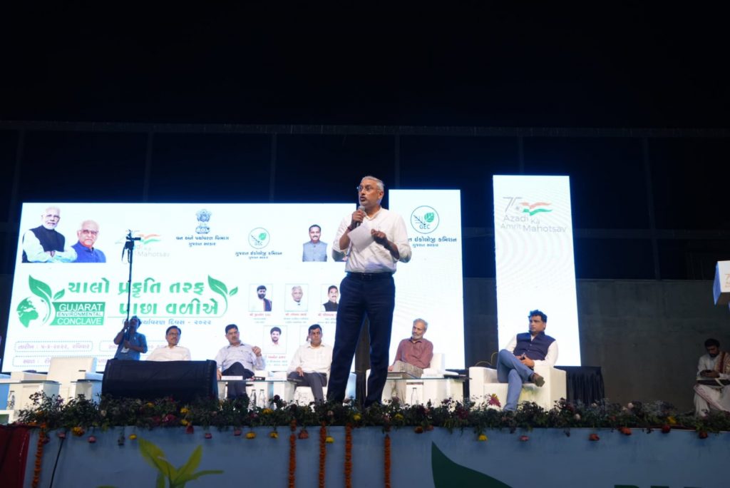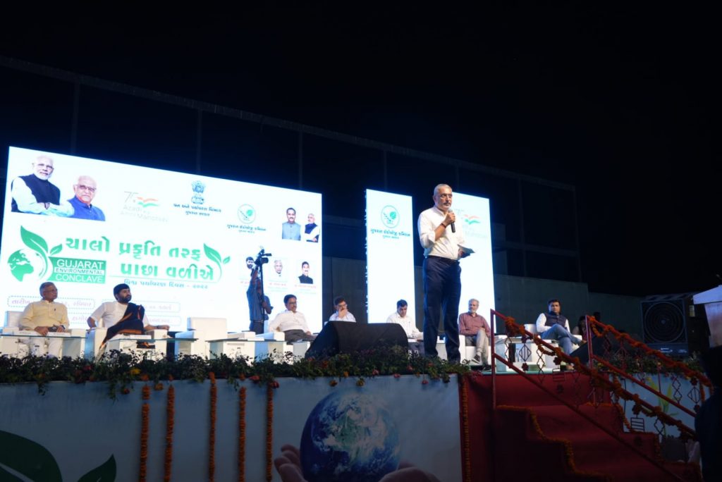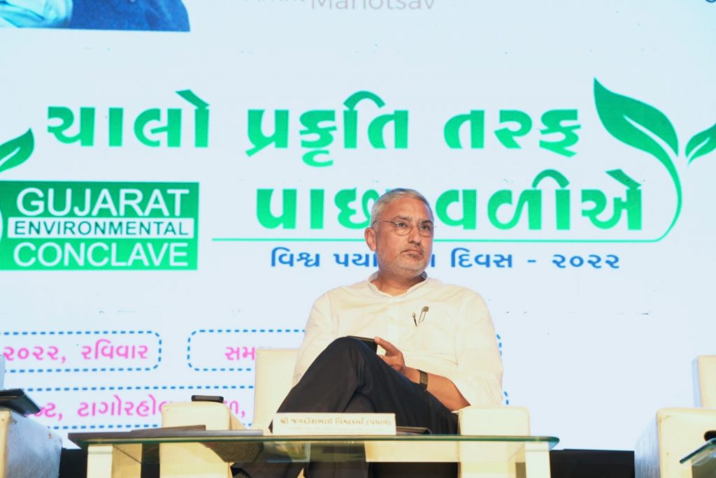 5 જૂન, વિશ્વ પર્યાવરણ દિવસ નિમિત્તે પર્યાવરણીય જીવનશૈલી અપનાવવાના મંત્ર સાથે પર્યાવરણ, સ્વચ્છતા, જળસંચય અને જળસંરક્ષણ માટે સંવાદિતા ઉભી થાય તે હેતુથી “ચાલો પ્રકૃતિ તરફ પાછા વળીએ” ટોક શૉ યોજાયો હતો. ગુજરાત સરકારના વન પર્યાવરણ વિભાગ અને ગુજરાત ઇકોલોજી કમિશનના સંયુક્ત ઉપક્રમે આ કાર્યક્રમનું આયોજન થયું હતું. રાજ્ય સરકારના મંત્રી શ્રી જગદીશભાઈ વિશ્વકર્મા, શ્રી જીગ્નેશ દાદા, RSSના રાષ્ટ્રીય કન્વીનર શ્રી ગોપાલ આર્ય સહિતના વિવિધક્ષેત્રના મહાનુભાવોએ દીપ પ્રાગટ્ય સાથે આ સંવાદ કાર્યક્રમ ખુલ્લો મુકાયો હતો. આ કાર્યક્રમનું મુખ્ય આકર્ષણ મંત્રી શ્રી જગદીશભાઈ વિશ્વકર્માએ શ્રોતાઓ વચ્ચે જઈને કરેલો સંવાદ હતો. જેમાં એક યુવાને બાળકના જન્મ સમયે 10 વૃક્ષો વાવવાનો સંકલ્પ લેવાની આહલેક જગાવી તો એક વડીલે પર્યાવરણીય કાયદાઓનું પાલન કરવા લોકોને અપીલ કરી. મંત્રી શ્રીએ વધુમાં જણાવ્યું કે આપણે પર્યાવરણને લાગતા વિવિધ 19 દિવસો ઉજવીએ છીએ પણ આ ઉજવણી માત્ર એક દિવસ પૂરતી સીમિત ન રહેવી જોઈએ. સાથે જ તેમણે Respect Food ઝુંબેશનો ઉલ્લેખ કરતા ભોજનનો બગાડ અટકાવવા જનઅપીલ કરી. મંત્રી શ્રીએ ભોજનનો મહિમા સમજાવતા કહ્યું કે, “1 કિલો ઘઉં પકવવા 800 લીટર અને 1 કિલો ચોખા પકવવા 5000 લીટર જેટલા પાણીનો ઉપયોગ થાય છે. આપણી થાળીમાં વધતું ભોજન ગરીબ માણસોનું પેટ ભરવા પૂરતું છે.” આગામી સમયમાં સરકાર પર્યાવરણ જતન માટે શું નવું કરી શકે તે માટે લોકોના સૂચનો મંગાવવા માટે મંત્રી શ્રીએ ઓન ધ સ્પોટ ઇમેઇલ આઈડી mosoffice.gujrat@gmail.com જાહેર કરીને સરકાર ટેક્નોસેવી હોવાનો પરિચય આપ્યો.વન, પર્યાવરણ વિભાગના અધિક મુખ્ય સચિવ શ્રી અરુણકુમાર સોલંકીએ કાર્યક્રમની રૂપરેખા આપી હતી. આ તબક્કે ઉપસ્થિત અમદાવાદ મ્યુનિસિપલ કોર્પોરેશનના કમિશ્નર શ્રી લોચન શહેરાએ અમદાવાદમાં નાગરિક દીઠ એક વૃક્ષ વાવવાનો લક્ષ્યાંક જાહેર કર્યો. કોર્પોરેશન દ્વારા લોકોને તેમના સ્થળે વાવવા માટે વૃક્ષ ઉપલબ્ધ કરાવતી “પ્લાન્ટ ઓન ડિમાન્ડ” ઝુંબેશનો લાભ લેવા પણ વિનંતી કરી. આ અવસરે કથાકાર જીજ્ઞેશ દાદાએ પણ આગામી કથાથી યજમાનોના હાથે વૃક્ષારોપણ કરાવવાની પહેલ શરૂ કરવાનું વચન આપ્યું. RSSના આંતરરાષ્ટ્રીય કન્વીનર ગોપાલ આર્યજીએ ઉપસ્થિત લોકોને કેમિકલ ફ્રી ઘર, વીજળીની બચત, ઘરમાં નર્સરી અને પોલીથીન મુક્ત ઘર બનાવવુ એવા 4 સંકલ્પો કરાવ્યા. પૂર્વ RJ ધ્વનિતે કવિતાઓ દ્વારા પ્રકૃતિના જતનનો સુંદર સંદેશ પાઠવ્યો. આ કાર્યક્રમમાં ‘મૈં ભી આત્મનિર્ભર’ પુસ્તકનું વિમોચન ઉપસ્થિત મહેમાનોએ કર્યું. સાબરમતી નદીના સાનિધ્યમાં યોજાયેલા આ કાર્યક્રમમાં ગુજરાત ઇકોલોજી મિશનના પદાધિકારીઓ, સામાજિક આગેવાનો અને બહોળી સંખ્યામાં પર્યાવરણપ્રેમી જનતાએ હાજરી આપી હતી.
