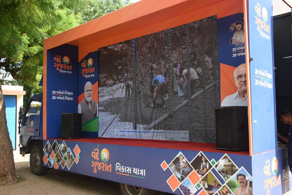 નખત્રાણા તાલુકાના નિરોણા ગામ ખાતે ૨૦ વર્ષનો વિશ્વાસ ૨૦ વર્ષનો વિકાસ વંદે ગુજરાત વિકાસયાત્રાના રથનુ ત્રીજા દિવસે આગમન થતાં ગામ લોકો દ્વારા સામૈયું કરીને ઉત્સાહભેર સ્વાગત કરાયું હતું. આ પ્રસંગે અબડાસાના ધારાસભ્યશ્રી પ્રધ્યુમનસિંહ જાડેજાએ જણાવ્યું હતું કે, યોજનાનો વધારેમાં વધારે લોકોને લાભ મળે અને લોકો સમૃદ્ધ બને તે જ આ સરકારનો ધ્યેય છે. આ તકે તેમણે સરકારશ્રીની યોજનાઓ જેવી કે કૃષિ ધિરાણ યોજના, પ્રધાનમંત્રી આયુષ્માન કાર્ડ યોજના, કિસાન સમ્માન નિધિ યોજના, પશુ સહાય યોજના, માતૃ શકિત યોજના, ખેતીવાડી વીજ કનેકશન અને વિવિધ યોજનાની સહાય યોજનાની માહિતી અને ચેક વિતરણ કર્યા હતા. વંદે ગુજરાત કાર્યક્રમ હેઠળ નખત્રાણા તાલુકાના નિરોણા ગામે રૂ.૧.૧૦ કરોડના સીસીરોડ, ઈન્ટરલોક, ગટરલાઈન, પૂર સંરક્ષણ દિવાલ, શેડ, દિવાલ વગેરે કામોનું અબડાસા ધારાસભ્યશ્રી પ્રધ્યુમનસિંહ જાડેજાના વરદહસ્તે પ્રજાર્પણ કરાયાં હતાં. વંદે ગુજરાત વિકાસયાત્રા અંતર્ગત શાળામાં ચિત્ર સ્પર્ધા, નિબંધ સ્પર્ધાની પણ ઉજવણી કરવામાં આવી હતી અને પ્રમાણપત્ર આપવામાં આવ્યાં હતાં. આ વિકાસ રથ દ્વારા ગુજરાતની વિકાસગાથા અને ટૂંકી ફિલ્મ ગામલોકોને બતાવીને વિકાસનું વર્ણન દર્શાવ્યું હતું. આ પ્રસંગે જિલ્લા પંચાયત આરોગ્ય કારોબારી ચેરમેનશ્રી કરસનજી જાડેજા, નખત્રાણા તાલુકા પંચાયત પ્રમુખશ્રી જયસુખભાઈ પટેલ, નખત્રાણા તાલુકા પંચાયત કારોબારી ચેરમેનશ્રી મહેન્દ્રસિંહ જાડેજા, અગ્રણી સર્વશ્રી દિલીપભાઇ નરસંગાણી, હરિસિંહ રાઠોડ, જીતેન્દ્રસિંહ જાડેજા, કિરણભાઈ ભાનુશાલી, ડાહ્યાભાઈ પટેલ, રમેશભાઈ આહીર, વિરમભાઈ આહીર, વેલુભા જાડેજા નિરોણા સરપંચશ્રી નરોતમભાઈ આહીર, પાલનપુર બાડી સરપંચશ્રી પ્રવીણભાઈ છાભૈયા, નખત્રાણા વેટરનરી ઓફીસરશ્રી એમ.કે.પટેલ, THO પ્રશાંતભાઇ, વિસ્તરણ અધિકારીશ્રી મેહુલભાઇ પ્રજાપતિ, નિરોણા તલાટીશ્રી એચ.એમ.પ્રજાપતિ, ગ્રામ પંચાયતના સભ્યો, અગ્રણીઓ, શિક્ષણગણ અને મોટી સંખ્યામાં ગ્રામજનો ઉપસ્થિત રહ્યા હતાં