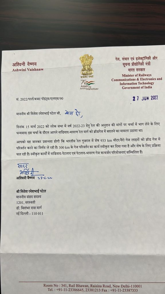 તારીખ 15 માર્ચ 2022 લોકસભામાં 2022-23 વર્ષ માં રેલ્વે અનુદાન પર ચર્ચા કરવામા આવેલ ત્યારે આણંદના સાંસદ શ્રી મિતેષભાઇ પટેલ દ્વારા રેલ્વે અનુદાનની માંગ કરેલ જેમા નડિયાદ – પેટલાદ તેમજ પેટલાદ – ભાદરણ રેલ્વે ને બ્રોડ ગેજ કન્વર્ઝન કરવા લોકસભામાં પ્રશ્ન મુકેલ હતો.