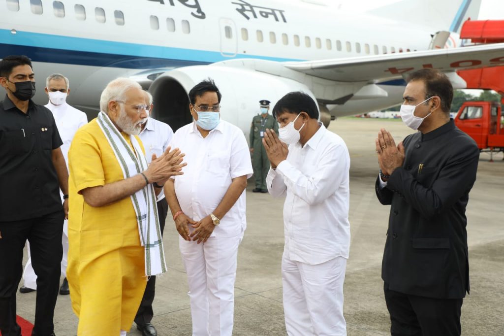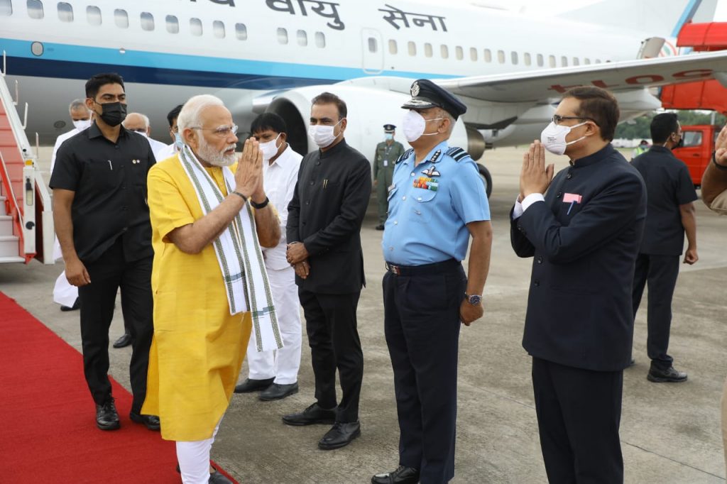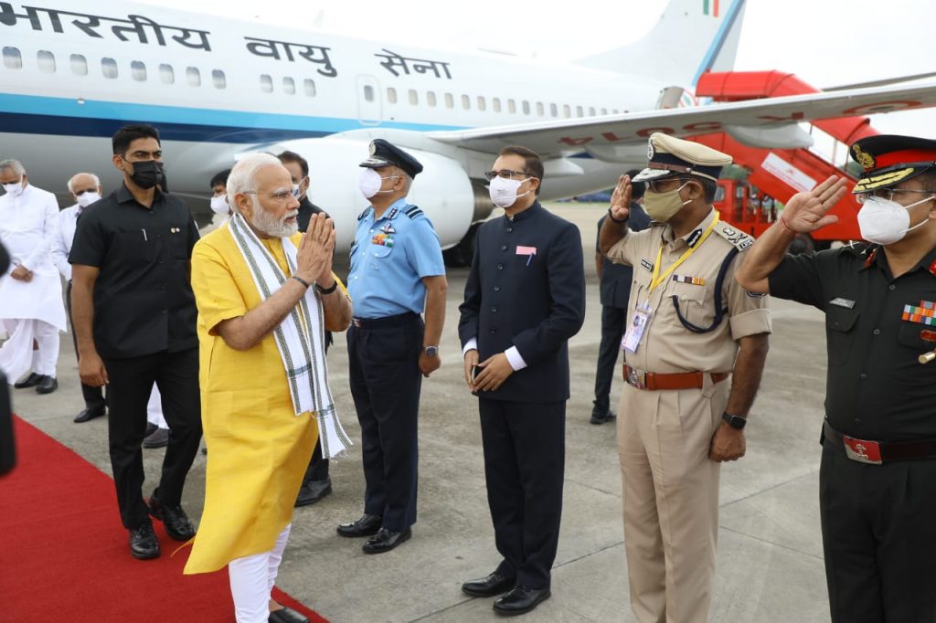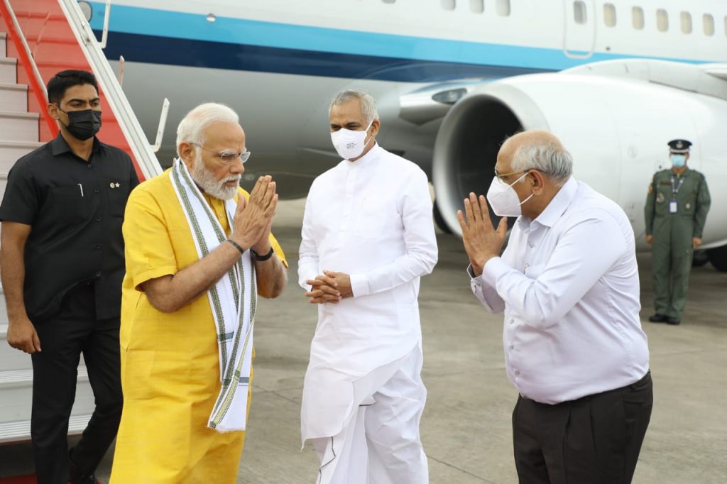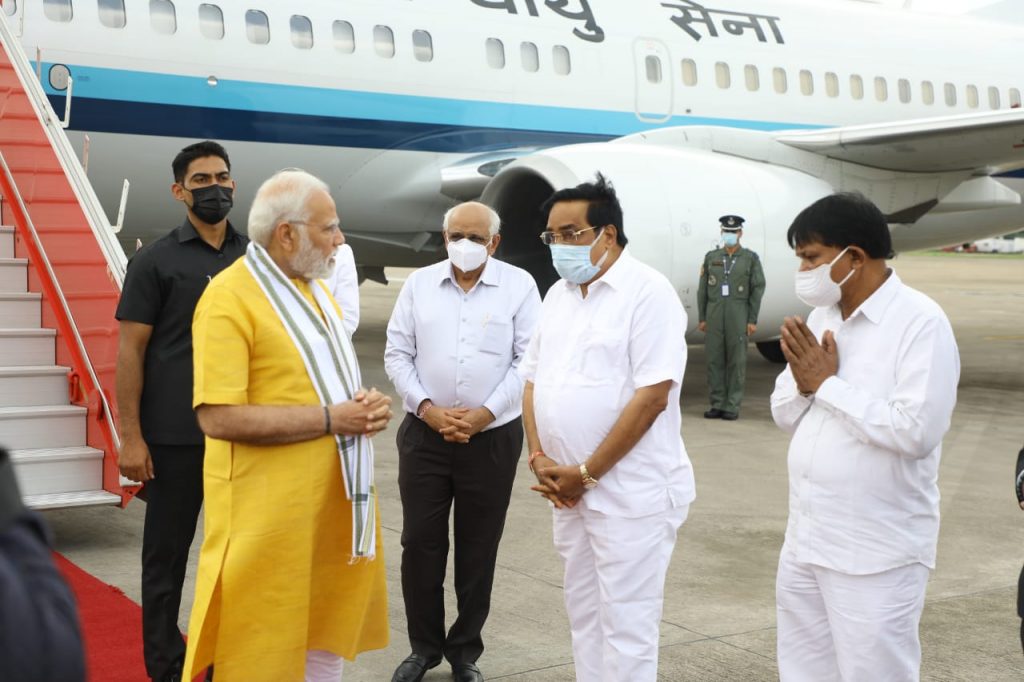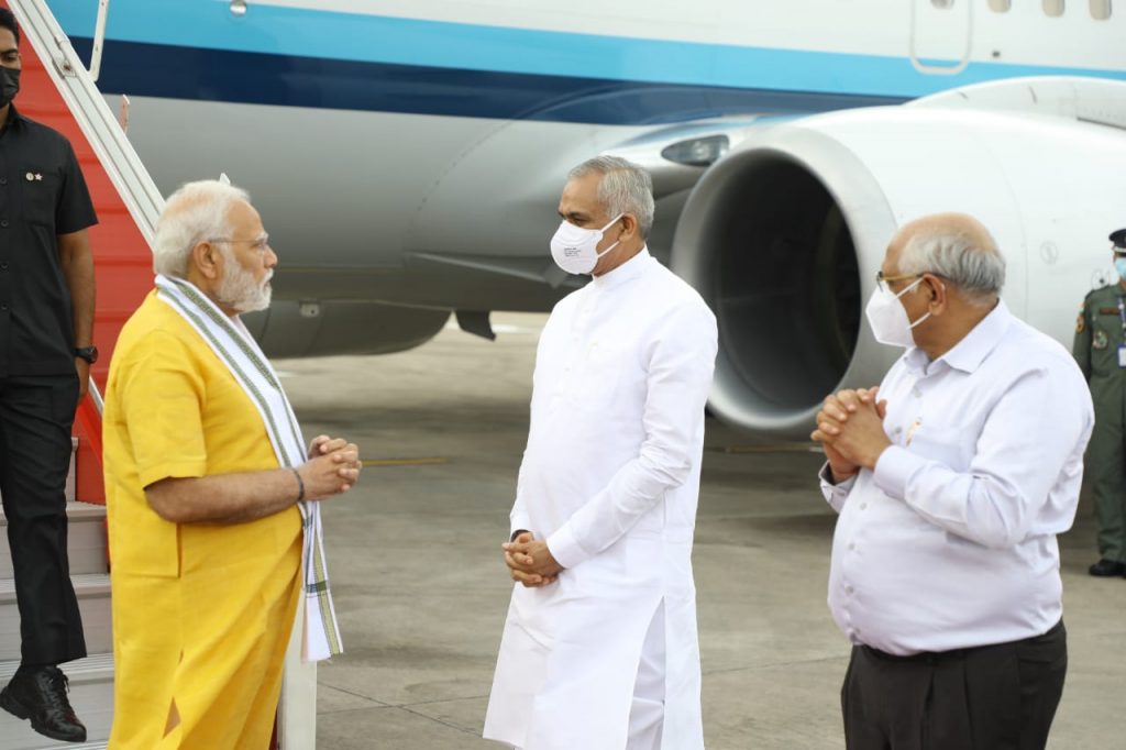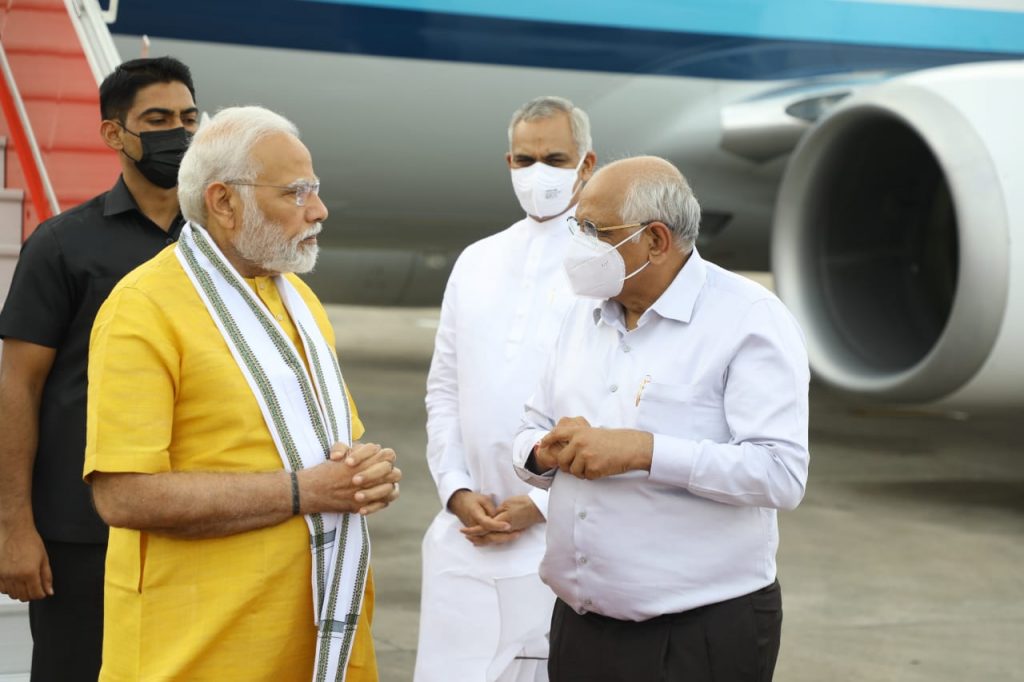 વડાપ્રધાન શ્રી નરેન્દ્રભાઈ મોદી આજે ગુજરાતની મુલાકાતે આવી પહોચ્યા હતા. અમદાવાદ એરપોર્ટ ખાતે ગુજરાતના રાજ્યપાલ શ્રી આચાર્ય દેવવ્રત અને મુખ્યમંત્રી શ્રી ભૂપેન્દ્રભાઈ પટેલે વડાપ્રધાનશ્રીનું ઉષ્માસભર સ્વાગત કર્યું હતું. આ અવસરે નવસારીના સાંસદ અને ભાજપ પ્રદેશ પ્રમુખ શ્રી સી. આર. પાટીલ, અમદાવાદના મેયર શ્રી કિરીટભાઈ પરમાર, મુખ્ય સચિવ શ્રી પંકજકુમાર, રાજ્યના પોલીસ વડા શ્રી આશિષ ભાટિયા, જિલ્લા કલેક્ટર શ્રી સંદીપ સાગલે અને સેનાના સિનિયર અફસરો સહિતના ઉચ્ચ અધિકારીઓએ પણ ઉપસ્થિત રહી વડાપ્રધાનશ્રીને આવકાર્યા હતા