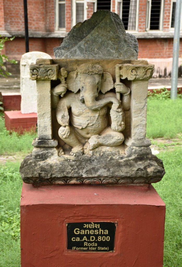 પાંચમી સદીની એક બીજી પ્રતિમામાં ગણપતિ દાદાને અનુચર સાથે દર્શાવવામાં આવ્યા છે. સામાન્ય રીતે બપ્પા સાથે મૂષક મહારાજ હોય છે પણ અહીં અનુચરનો ટેકો લઇ દાદા ઉભા છે. કાલા પથ્થરથી બનેલી આ પ્રતિમા અણહિલવાડ (ઉત્તર ગુજરાતના રોડા, ઇડર)થી મળી આવેલી છે. તેની જમણી ભૂજા ભગ્ન છે. તેના ઉપર સર્પ છે.