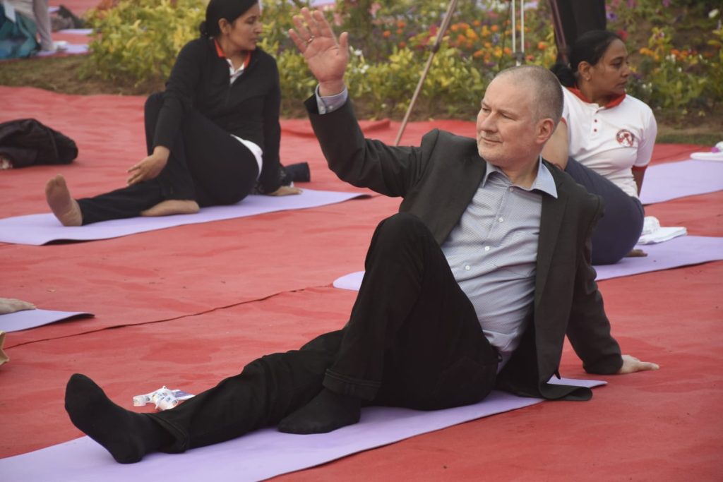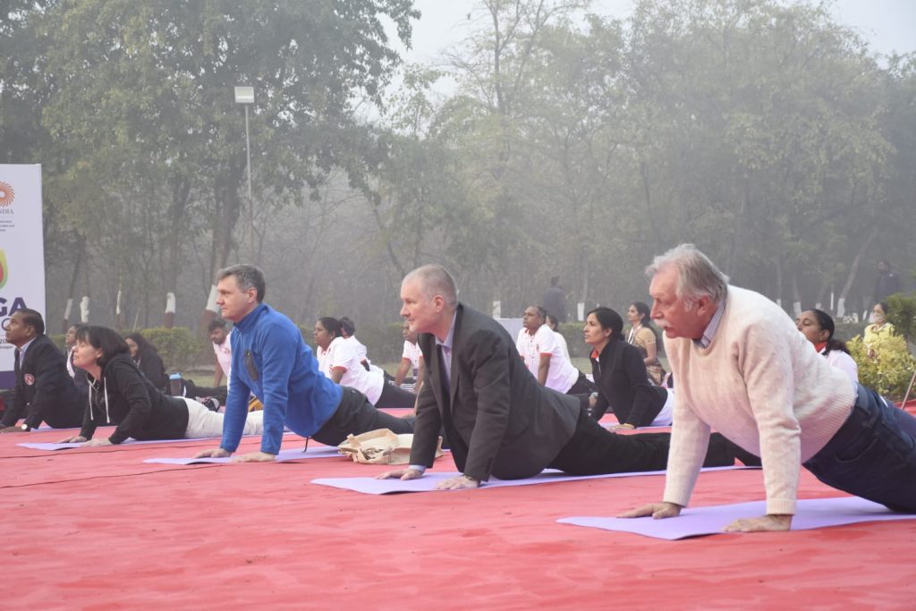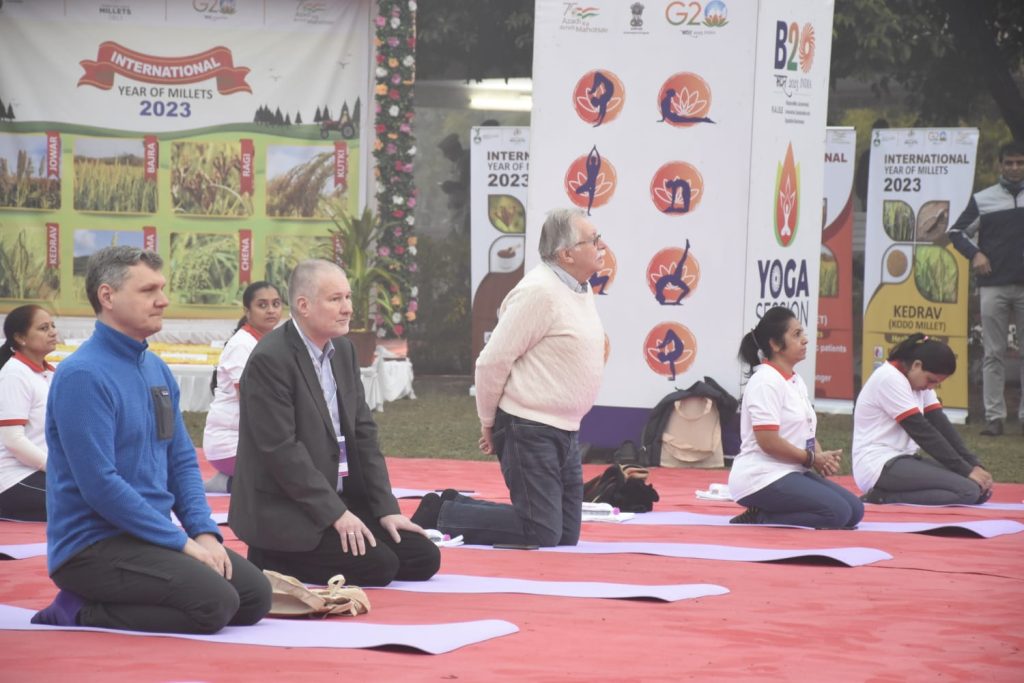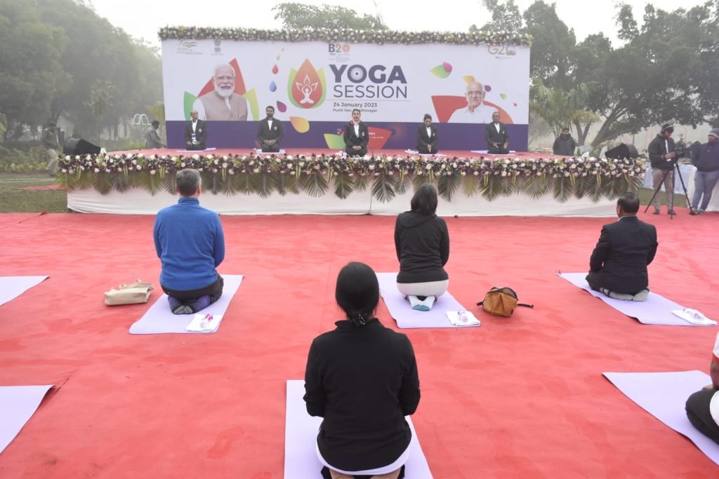 ગાંધીનગર ખાતે જી૨૦ અંતર્ગત આયોજિત બી-૨૦ ઇન્ડિયા ઇન્સેપ્શન મીટીંગના અંતિમ દિવસે દેશ-વિદેશથી પધારેલા ડેલીગેટ્સ માટે યોગ સત્રનું આયોજન કરવામાં આવ્યું હતું. ગાંધીનગરના પુનિતવન ખાતે વહેલી સવારે દેશ વિદેશના ડેલીગેટ્સે યોગાભ્યાસ કર્યો હતો. ભારતીય યોગ પરંપરાને દેશ વિદેશમાં પહોંચાડવા વડાપ્રધાન શ્રી નરેન્દ્ર દ્વારા અથાગ પ્રયત્નો કરવામાં આવી રહ્યા છે ત્યારે આ પ્રસંગે ઉપસ્થિતિ યોગગુરુએ પણ ડેલીગેટ્સને યોગ, તેના લાભ અને તેના ઈતિહાસ વિશે માહિતગાર કર્યા હતા.