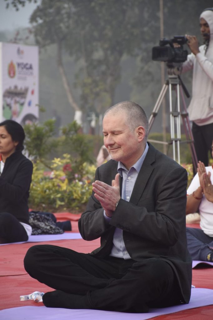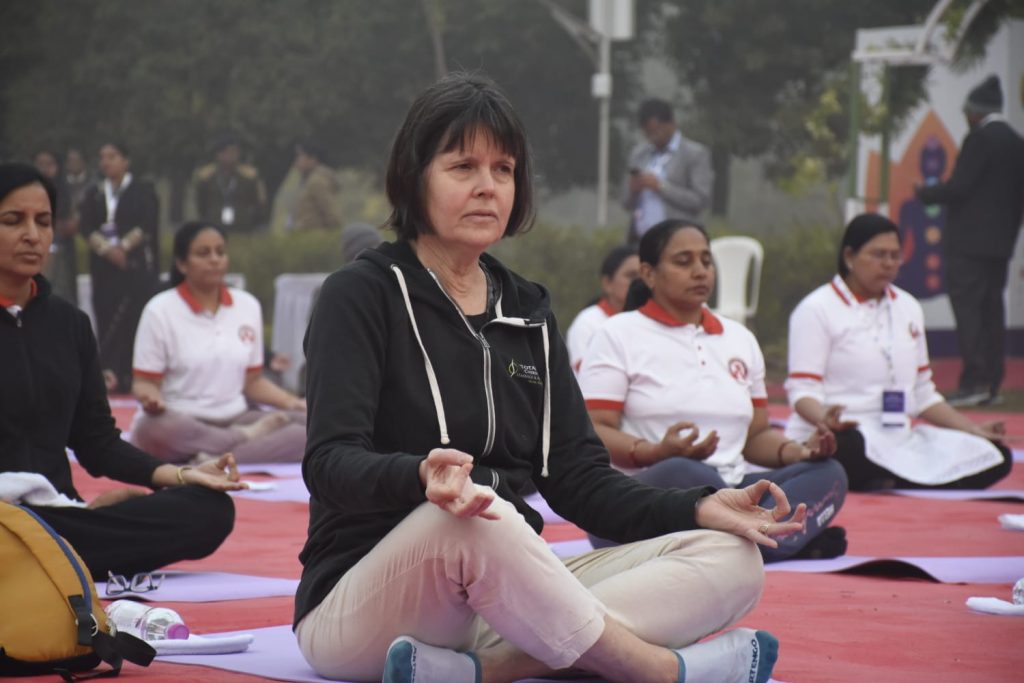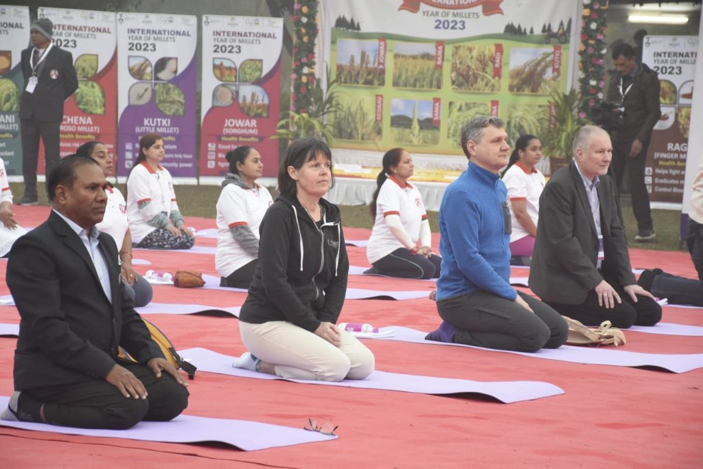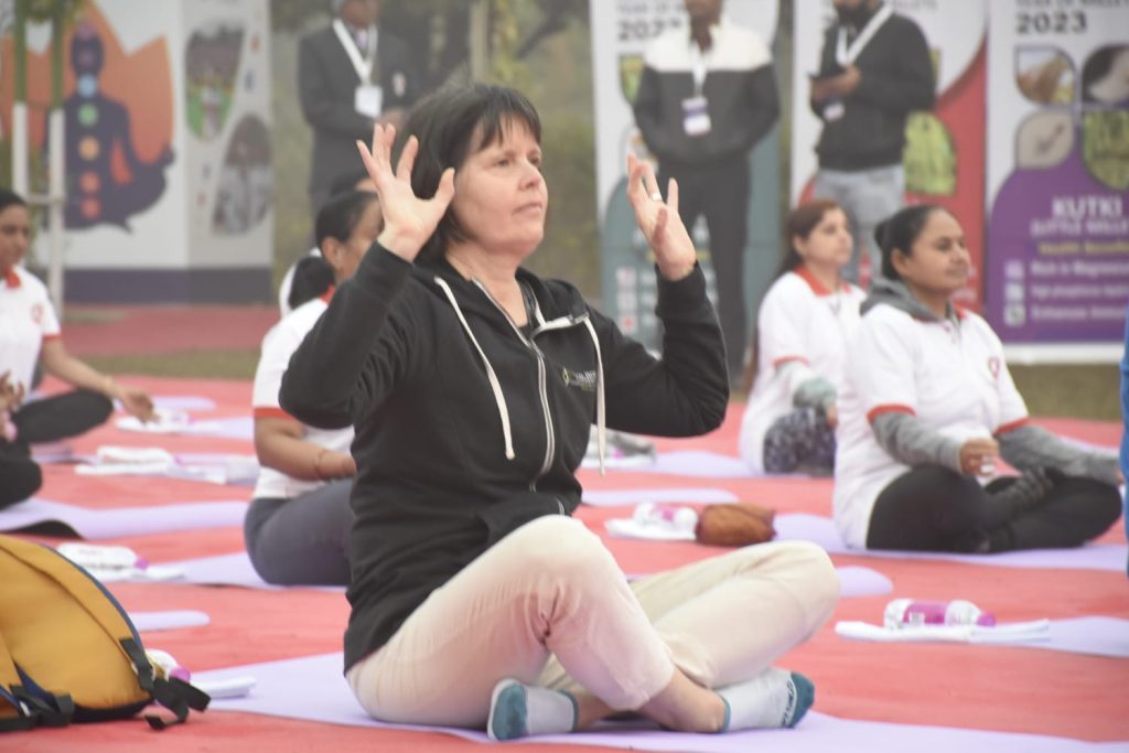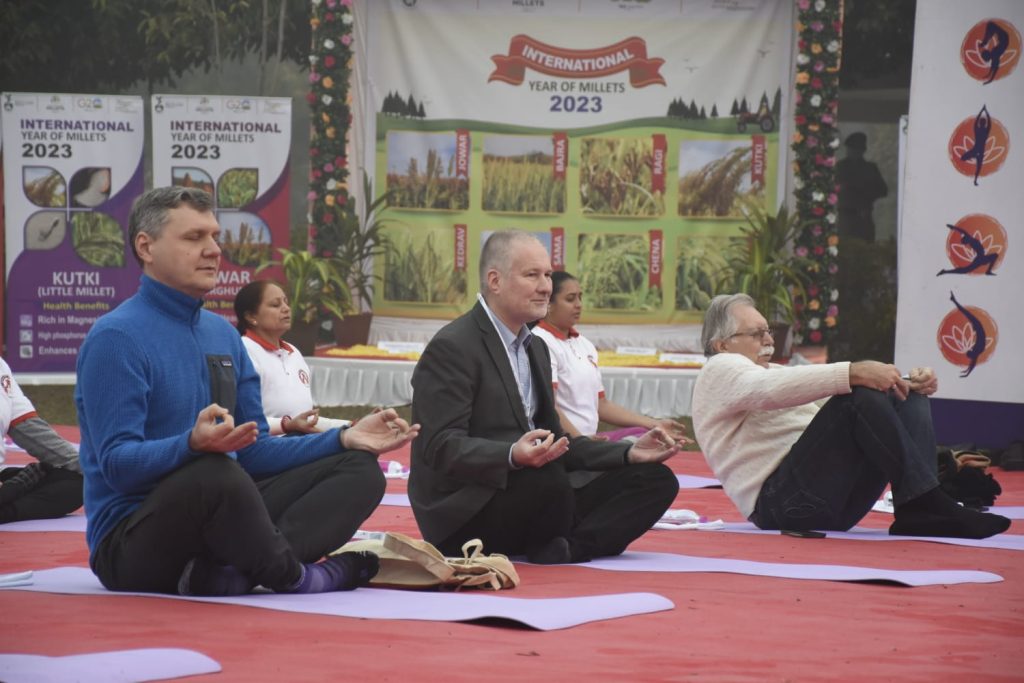 ગાંધીનગર ખાતે જી૨૦ અંતર્ગત આયોજિત બી-૨૦ ઇન્ડિયા ઇન્સેપ્શન મીટીંગના અંતિમ દિવસે દેશ-વિદેશથી પધારેલા ડેલીગેટ્સ માટે યોગ સત્રનું આયોજન કરવામાં આવ્યું હતું. ગાંધીનગરના પુનિતવન ખાતે વહેલી સવારે દેશ વિદેશના ડેલીગેટ્સે યોગાભ્યાસ કર્યો હતો. ભારતીય યોગ પરંપરાને દેશ વિદેશમાં પહોંચાડવા વડાપ્રધાન શ્રી નરેન્દ્ર દ્વારા અથાગ પ્રયત્નો કરવામાં આવી રહ્યા છે ત્યારે આ પ્રસંગે ઉપસ્થિતિ યોગગુરુએ પણ ડેલીગેટ્સને યોગ, તેના લાભ અને તેના ઈતિહાસ વિશે માહિતગાર કર્યા હતા.