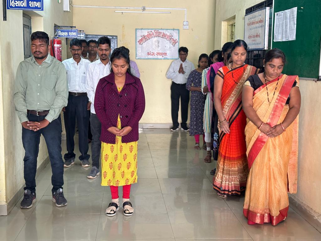 જિલ્લા સેવા સદન ખાતે નિવાસી અધિક કલેકટર શ્રી પદ્મરાજ ગાવિત સહિત ચિટનિશ શ્રી અર્જુન ચાવડા, મામલતદાર શ્રી યુ.વી.પટેલ, અને નાયબ મામલતદાર શ્રી પ્રકાશભાઇ મહાલા સહિત મહેસુલી અધિકારી, કર્મચારીઓએ ૧૧ વાગ્યે, સાયરનના ધ્વનિ સાથે જ બે મિનિટનુ મૌન પાળી, શહીદોને શ્રદ્ધાંજલિ પાઠવી હતી. તો જિલ્લા પંચાયતની મહેકમ શાખા દ્વારા પણ નાયબ જિલ્લા વિકાસ અધિકારી શ્રી યોગેશ જોશી તથા તેમના કર્મયોગીઓએ બે મિનિટનું મૌન ધારણ કર્યું હતું. આ સાથે જ જિલ્લા અને તાલુકાઓની જુદી જુદી કચેરીઓમા પણ સંબંધિત અધિકારી, કર્મચારીઓએ શહીદોની સ્મૃતિમા બે મિનિટનુ મૌન પાળી, શહીદોને શ્રદ્ધા સુમન અર્પણ કર્યા હતા.