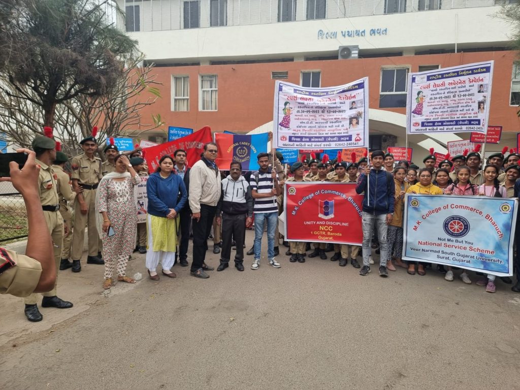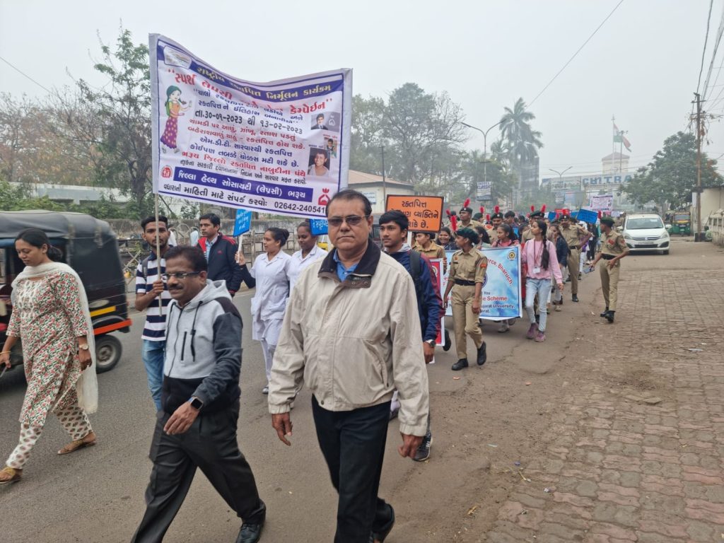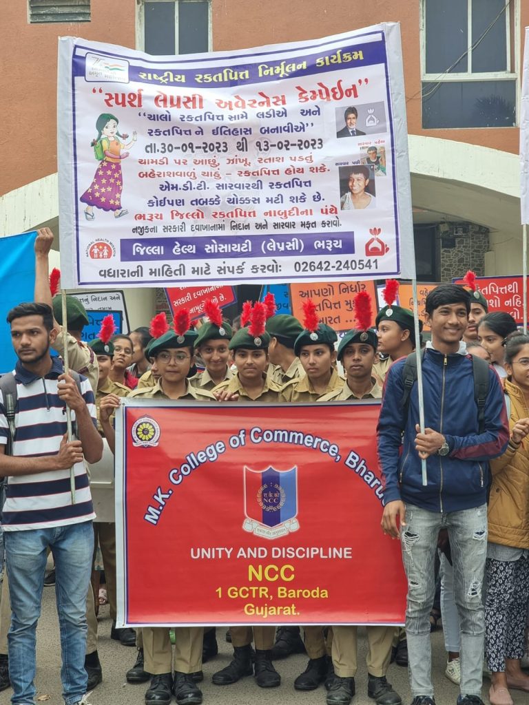 રક્તપિતને ઈતિહાસ બનાવવાના હેતુસર“એન્ટી લેપ્રસી ડે” નિમિત્તે “સ્પર્શ લેપ્રસી અવેરનેશ કેમ્પેઇન” હેઠળ જિલ્લામાં ૩૦ જાન્યુઆરીથી એક પખવાડીયા સુધી રક્તપિત્ત જનજાગૃતિનું અભિયાન હાથ ધરવામાં આવ્યું છે. ત્યારે ભરૂચ ખાતે રક્તપિત નિર્મૂલન દિવસ નિમિત્તે સ્પર્શ રક્તપિત જન જાગૃતિ અભિયાન માટે જિલ્લા પંચાયતથી વિવિધ શાળાના વિદ્યાર્થીઓ, એનસીસીના વિદ્યાર્થીઓ, ઉપસ્થિત મહાનુભાવો સાથે પોસ્ટર તેમજ બેનરો સાથે જન જાગૃતિ અભિયાન માટે રેલી કાઢી હતી.