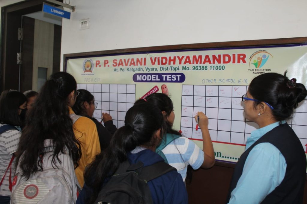 S.S.C બોર્ડની પરીક્ષા આપનાર વિદ્યાર્થીઓનો પરીક્ષા પ્રત્યેનો ડર, ભય અને હાવ દૂર થાય અને બોર્ડની પરીક્ષાનો પ્રત્યક્ષ અનુભવ થાય તે હેતુને ધ્યાનમાં રાખીને મોડલ ટેસ્ટનું આયોજન કરવામાં આવ્યું હતું. મોડેલ ટેસ્ટ આપનાર વિદ્યાર્થીઓનો કુમકુમ તિલક કરી મોં મીઠુ કરાવીને સ્વાગત કરવામાં આવ્યું. વિદ્યાર્થીઓને બોર્ડની પરીક્ષામાં પોતાનું લક્ષ્યાંક સિદ્ધ કરવા પોતાનો પર્સન્ટેજ ટાર્ગેટ લખી સહી કરી સફળતા પ્રાપ્ત કરવા સંકલ્પ કર્યો.બોર્ડની જેમ જ દરેક વિદ્યાર્થીને હોલ ટિકિટ, બારકોડ સ્ટીકર, બો ર્ડની ઉત્તરવહી-પુરવણી,સમય સંપૂર્ણ પરીક્ષા પદ્ધતિ મુજબ પરીક્ષા લેવામાં આવી,જે પી.પી. સવાણી વિદ્યામંદિર,વ્યારા ની આગવી ઓળખ છે.શાળાના ટ્રસ્ટીઓ, આચાર્યશ્રી તથા સમગ્ર સ્ટાફ મિત્રો એ ઉપસ્થિત રહી દરેક વિદ્યાર્થીને સારું પરિણામ લાવવા માટે શુભ આશિષ પાઠવ્યા.સમગ્ર આયોજન વ્યવસ્થા અને સંકલન શાળાના આચાર્યશ્રી અલ્પેશ ગજેરા ના માર્ગદર્શન હેઠળ કરવામાં આવ્યું