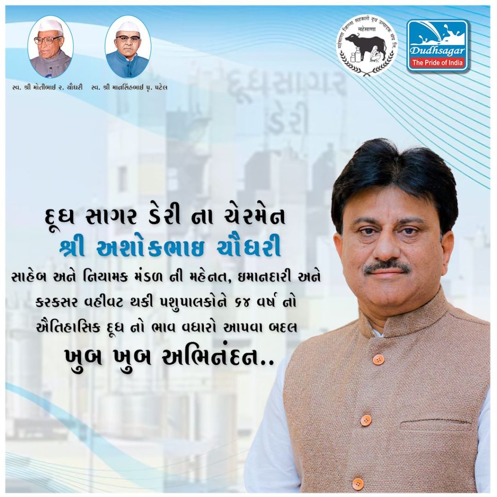 મહેસાણા દૂધસાગર ડેરીના ચેરમેન અશોકભાઈ ચૌધરીએ દૂધ ઉત્પાદકો માટે અઢળક જાહેરાતો કરી ડેરીનું વાર્ષિક ટન ઓવર 910 કરોડના વધારા સાથે અત્યારે 6938 કરોડ એ પહોંચ્યું દૂધસાગર ડેરીના 63 વર્ષના ઇતિહાસમાં ગત વર્ષે ચૂકવેલા સૌથી વધુ 321 કરોડ રૂપિયાના ભાવ વધારાનો રેકોર્ડ તોડી આ વર્ષે 375 કરોડ રૂપિયા ભાવ વધારો ચૂકવાશે ડેરી દ્વારા દૂધ ઉત્પાદકોના લેવાતા વીમા ની મર્યાદામાં ૫૯ વર્ષની હતી તે વધારીને હવે 65 વર્ષ કરાઈ ડેરી દ્વારા દૂધ ઉત્પાદકોના મરણ સમયે ચૂકવાતી વિમાની રકમ જે રકમ ₹35,000 હતી તે અત્યારે એક લાખ રૂપિયા કરાઈ ડેરી દ્વારા દૂધ ઉત્પાદકોને અકસ્માતથી મરણ સમયે વિમાની ચૂકવાતી રકમ એક લાખ રૂપિયા હતી તે વધારીને બે લાખ રૂપિયા કરાઈ દૂધ ઉત્પાદકોને ચૂકવાતા દૂધના ભાવમાં ફરીથી 10 રૂપિયાનો વધારો કરી 810 રૂપિયા ભાવ કરાયો અને દૂધ મંડળીઓને 10% ડિવિડન્ડ ચૂકવાશે