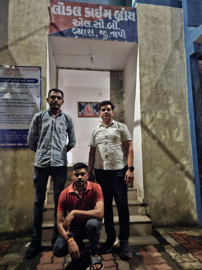 કામગીરી કરનાર ટીમ, અ, હે, કો,જગદીશભાઈ બ. ન.૩૮૮, એલ,સી,બી તાપી અ. હે.કો, અનિરુદ્ધસિંહ દેવસિંહ બ. ન,૭૧૬ તથા અ. પો. કો, રવિન્દ્રભાઈ મહેન્દ્રભાઈ બ. ન.૯૦૭ તથા પેરોલ ફર્લો સ્કોર્ડના અ.હે.કો. બીપીનભાઈ રમેશભાઈ બ. ન.૬૫૫ તથા અ. પો. કો. રાહુલભાઈ દિગંબર ભાઈ બ. ન,૭૪૦ નાઓને કામગીરી કરેલ છે.