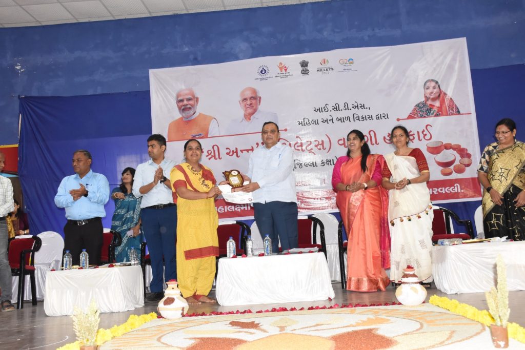 મિલેટ્સ વર્ષ ૨૦૨૩ અંતર્ગત આજ રોજ અરવલ્લી જિલ્લા આઇ.સી. ડી.એસ શાખા દ્વારા જિલ્લા કક્ષાની મેલેટ્સ વર્ષ -૨૦૨૩ ની ઉજવણી કરવામાં આવી.જે અંતર્ગત બેહેનો દ્વારા દરેક પ્રકારના મિલેટસ્ નો ઉપયોગ કરી અનેક પ્રકારની વાનગીઓ બનાવવામાં આવી.અરવલ્લી જિલ્લાના પંચાયત આઈ.સી.ડી.એસ. શાખા દ્વારા મિલેટ્સમાંથી બનતી વાનગીઓનુ નિર્દેશન રાખવામાં આવ્યું જેમાં આંગણવાડીના બહેનોએ ભાગ લીધો હતો.તે બેહનોએ મિલેટ્સ માંથી 36 વાનગીઓ બનાવી હતી. જેમાં જુવારની કટલેસ, નુડલ્સ, કેક, પીઝા જેવી અનેક વાનગીઓ બનવવામાં આવી હતી.જેમાંથી પ્રથમ, દ્વિતીય અને તૃતીય ક્રમાંક આપવામાં આવ્યો હતો અને સર્ટીફીકેટ અને ટ્રોફી એનાયત કરવામાં આવી હતી.