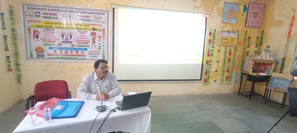 કેન્દ્ર સરકાર ની રાષ્ટ્રીય શિક્ષણ નીતિ અન્વયે એકવીસમી સદી ની જરૂરિયાત પ્રમાણે વ્યાપક રીતે બહુવિધ શિક્ષણ દ્વારા વાયબ્રન્ટ નોલેજ સોસાયટી અને જ્ઞાન મહા સત્તા માં રૂપાંતરિત કરવાંનુ આહવાન ભારત ના વડાપ્રધાન નરેન્દ્રભાઈ મોદીએ કર્યું છે જેના ભાગ રૂપે આજે એજ્યુકેશન પોલિસી ના ત્રણ વર્ષ ને મનાવવામાં આવી રહ્યું છે .આ સેલિબ્રેશન પોલિસી ની સમજ માટે અંકલેશ્વર ઓએનજીસી સ્થિત કેન્દ્રીય વિદ્યાલય ખાતે પત્રકાર પરિષદ નું આયોજન કરવામાં આવ્યું હતું જેમાં વિદ્યાર્થીઓ ને ચીલા ચાલુ ગોખણ પટ્ટી અભ્યાસ કરતા અન્ય સાદી સમજ થી તેમજ સાંપ્રત સમય અનુરૂપ અભ્યાસ કરવા બાબતે ;વિદ્યાર્થીઓ ની પ્રવેશ માટે ની ઉંમર નું પુનઃ માળખું રાષ્ટ્રીય શિક્ષણ નીતિ શિક્ષણશાસ્ત્રી ની પ્રકૃતિ અને અભ્યાસ કર્મ ની આવશ્કયતા ઓ ના આધારે પાયાના તબક્કા ના પાંચ વર્ષ જેમાં પ્રારંભિક સ્ટેજ ધોરણ ત્રણ થી પાંચ ત્રણ વર્ષ થી મિડલ સ્ટેજ અને ચાર વર્ષ સેકન્ડરી ની ભલામણ કરવામાં આવી છે