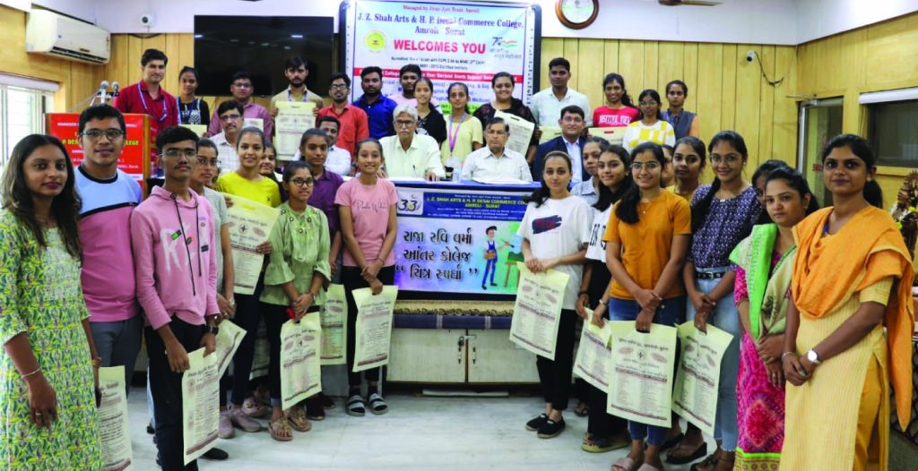 જીવન જ્યોત ટ્રસ્ટ, અમરોલી સંચાલિત જે.ઝેડ,શાહ્ આર્ટ્સ એન્ડ એચ.પી.દેસાઈ કોમર્સ કૉલેજ, અમરોલીમાં તા.૨૭-૦૭-૨૦૨૩ને ગુરૂવારના રોજ ઈ.ચા.પ્રિ.ડૉ.રાજેશકુમાર ડી.રાણાસાહેબના માર્ગદર્શન હેઠળ “રાજા રવિ વર્મા આંતર કૉલેજ ચિત્ર સ્પર્ધા”નું આયોજન કરવામાં આવ્યું હતું. સ્પર્ધાના મુખ્ય મહેમાન તરીકે એસ.પી.બી.સ્કૂલના આચાર્યશ્રી કેયુરભાઈ શર્મા અને કે.એન્ડ એમ.પી.પટેલ સ્કૂલના આચાર્યશ્રી પ્રતાપસિંહ બારસડીયા હાજર રહી સ્પર્ધકોને પ્રોત્સાહિત કર્યા હતા.સ્પર્ધાની શુભ શરૂઆત એફ.વાય.બી.કોમ.ની વિદ્યાર્થીની કુ.હેપ્પી પ્રજાપતિએ પ્રાર્થનાથી કરી હતી. ઈ.ચા.પ્રિ.ડૉ.રાજેશકુમાર ડી.રાણાસાહેબ દ્વારા શબ્દો અને પુસ્તકથી મહેમાનો તથા નિર્ણાયકશ્રીઓનું અભિવાદન કરવામાં આવ્યું હતું. સ્પર્ધાના કૉ-ઓર્ડીનેટર પ્રા. જીતેન્દ્રભાઈ વાછાણી દ્વારા મહેમાનો તથા પ્રા. ડૉ.મયંકભાઈ સોઢા દ્વારા નિર્ણાયકોનો પરિચય અને પ્રા. મેઘાબેન મહેતા દ્વારા સ્પર્ધકોને સ્પર્ધા વિષે સમજ આપી હતી. સમગ્ર વાતાવરણ આનંદ-ઉત્સાહ પૂર્ણ રહ્યું હતું. દક્ષિણ ગુજરાત વિસ્તારની જુદી જુદી કૉલેજોના ૩૫ વિદ્યાર્થીઓએ ઉત્સાહપૂર્વક ભાગ લીધો હતો. જેમાં પ્રથમ ક્રમે એમ.કે.મેહતા કૉલેજ ઓફ એજ્યુકેશન, ઉમરગામની વિદ્યાર્થીની કુ.પિંકીબેન હળપતિ, દ્વિતીય ક્રમે જે.બી.ધારૂકાવાલા ગર્લ્સ આર્ટ્સ કૉલેજની વિદ્યાર્થીની કુ.પ્રિયાંશીબેન પરમાર અને જે.ઝેડ.શાહ આર્ટ્સ એન્ડ એચ.પી.દેસાઈ કોમર્સ કૉલેજની વિદ્યાર્થીની કુ.રુદ્રા ભીડે, તૃતીય ક્રમે જે.ઝેડ.શાહ આર્ટ્સ એન્ડ એચ.પી.દેસાઈ કોમર્સ કૉલેજનો વિદ્યાર્થી શ્રી ધ્રુવિન ધામેલીયા અને જે.બી.ધારૂકાવાલા ગર્લ્સ આર્ટ્સ કૉલેજની વિદ્યાર્થીની કુ.મિતલ ગોસ્વામી વિજેતા જાહેર થયા હતા. સ્પર્ધામાં નિર્ણાયક તરીકે શ્રી જશવંતભાઈ નથુકારાવાલા અને શ્રી અજીતસિંહ ખેરહાજર રહ્યા હતા. સમગ્ર સ્પર્ધાનું સંચાલન ટી.વાય.બી.કોમ.ની વિદ્યાર્થીની કુ.નેન્સી બોરડ દ્વારા અને આભારવિધિ પ્રા.ભૂમિબેન મિસ્ત્રી દ્વારા કરવામાં આવી હતી.