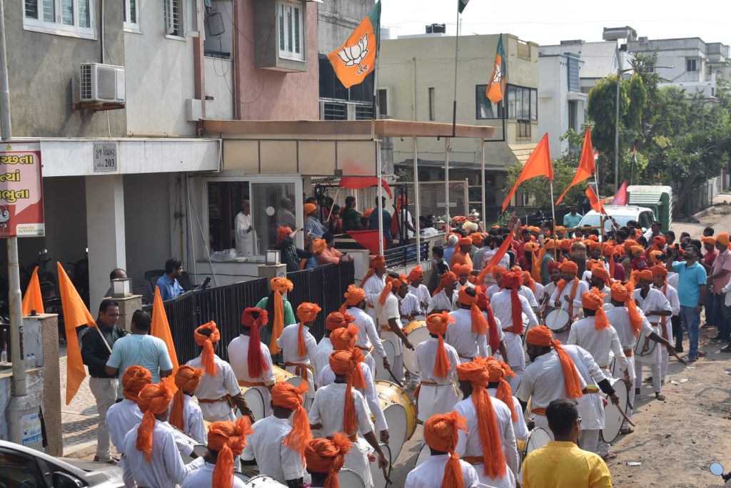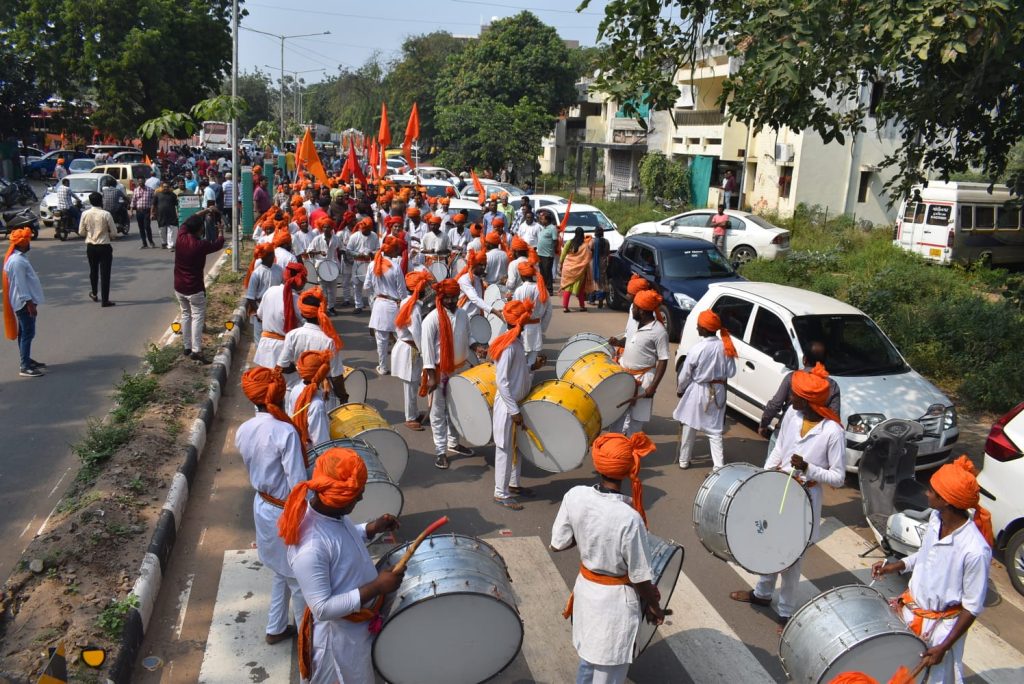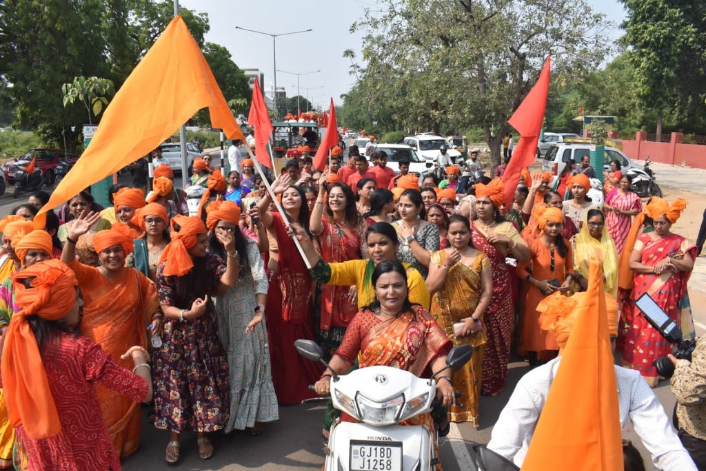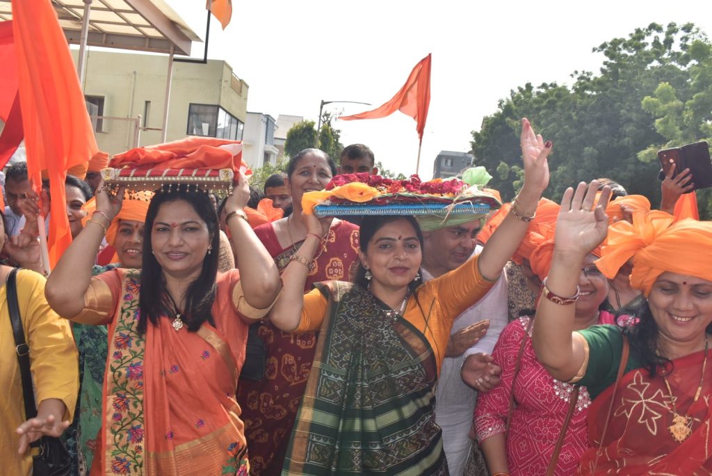 શોભાયાત્રામાં વિશાળ સંખ્યામાં ભાવિકો જોડાયા હતાં. ભાવિકોએ કેસરી સાફો પહેરતા તેમજ કેસરિયા ધ્વજાઓથી સમગ્ર શોભાયાત્રા કેસરિયામય બની હતી. વિશાળ શોભાયાત્રાનું સમગ્ર રૂટ પર વિવિધ સ્થાનોએ સ્થાનિકો દ્વારા પુષ્પવર્ષા થી સ્વાગત કરાયું હતું. પંચદેવ મંદિર, હવેલી મંદિર, વૈજનાથ મહાદેવ મંદિર, સ્વામિનારાયણ ગુરુકુળ સે.૨૩ ખાતે ધાર્મિક સંતો મહંતો દ્વારા સ્વાગત કરાયું હતું. નાસિક ઢોલ તેમજ ડી.જે તાલે ભાવિકો મન મૂકીને ઝૂમ્યા હતાં. ‘બોલ મારી અંબે જય જય અંબે‘ અને જય શ્રી રામના નાદથી સમગ્ર વાતાવરણ ગુંજી ઉઠ્યું હતું. કેસરિયા ગરબા ખાતે શ્રી રામ મંદિરની ૧૦૧ ફૂટ ઊંચી પ્રતિકૃતિમાં ભગવાન શ્રી રામ, લક્ષ્મણજી, જાનકી માતા, અને હનુમાનજીની દ્રશ્યમાન મૂર્તિનું પણ સ્થાપન કરવામાં આવ્યું છે.
