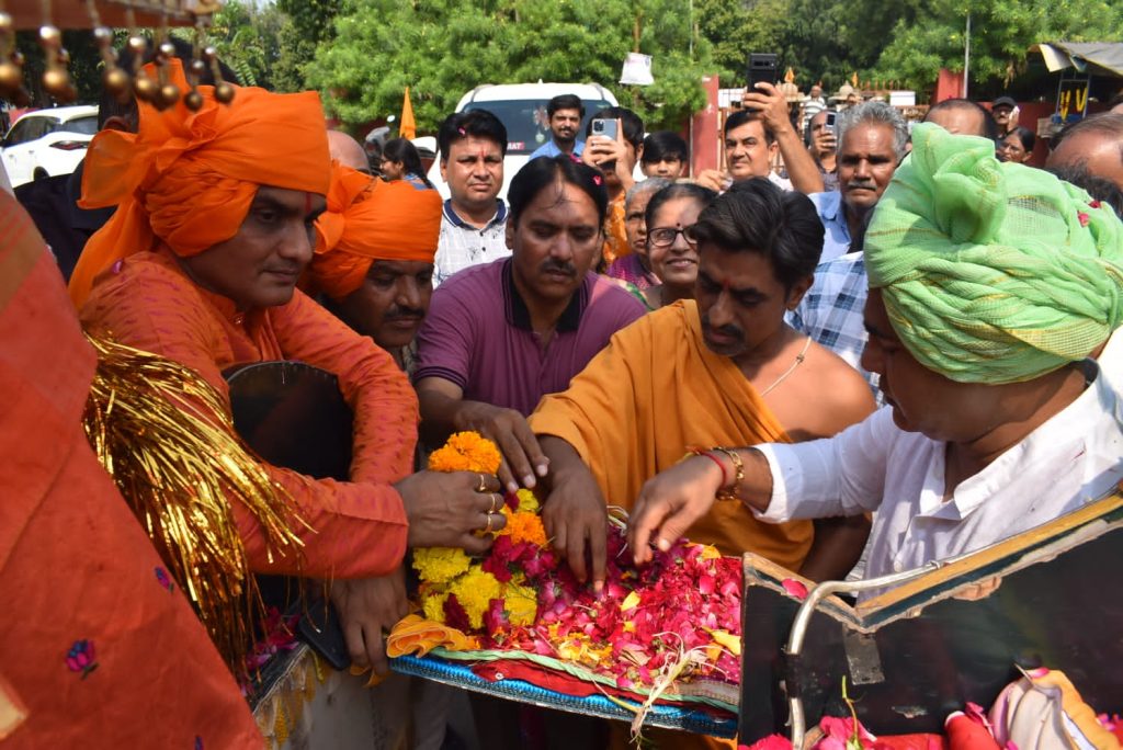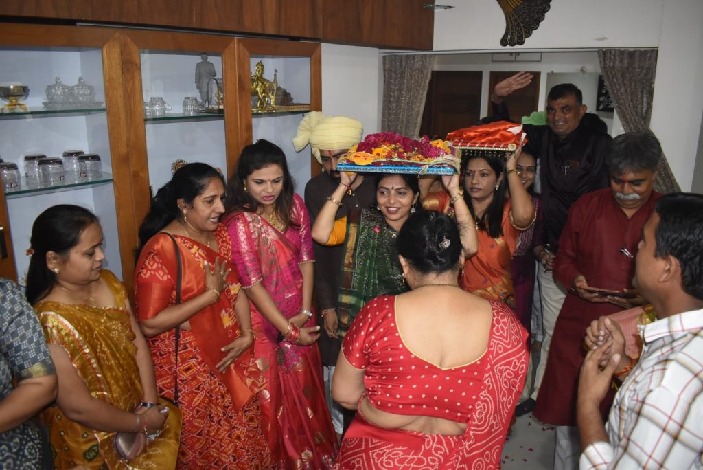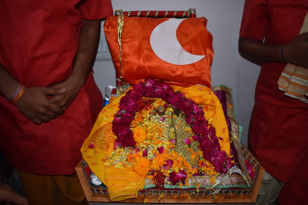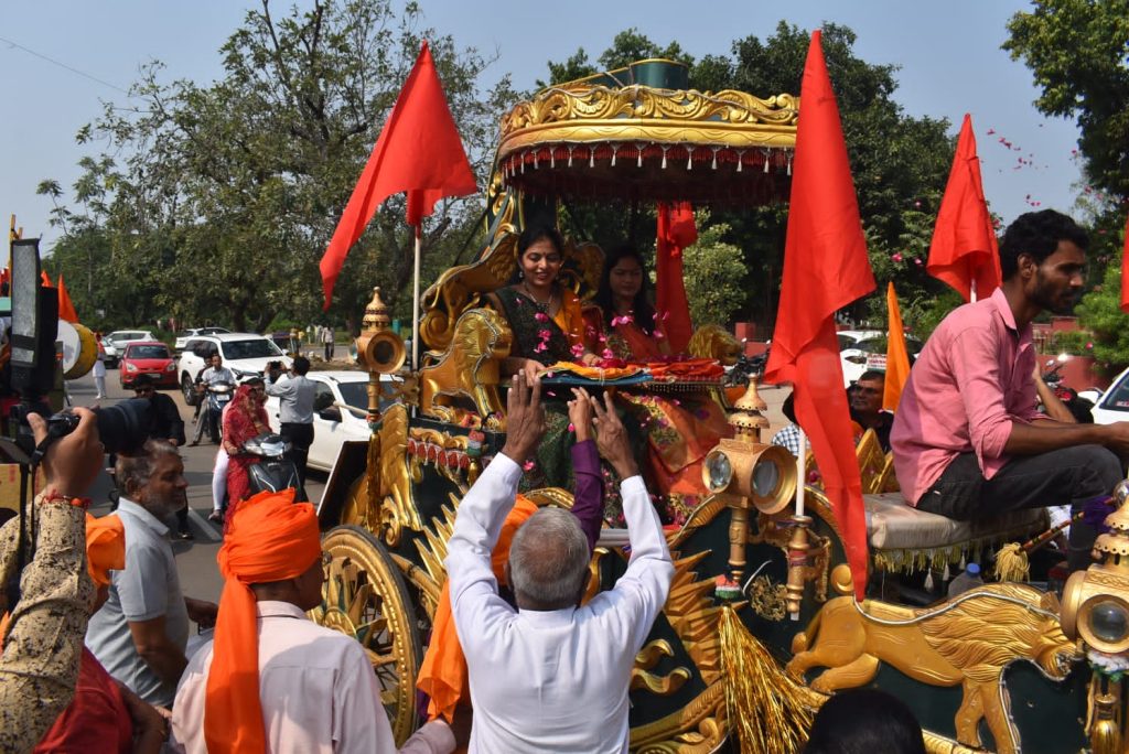 આજરોજ પ્રથમ નોરતે ધારાસભ્ય રીટાબેન પટેલના નિવાસસ્થાને સહાય ફાઉન્ડેશન દ્વારા અયોધ્યાથી લવાયેલ ભગવાન શ્રી રામની પાદુકાઓનું પૂજન અને આરતી કરાઇ હતી. જ્યાંથી ભવ્યાતિભવ્ય‘શ્રી રામ પાદુકા શોભાયાત્રા‘ પંચદેવ મંદિર (સે.૨૨), હવેલી મંદિર (સે.૨૧), સિદ્ધિ વિનાયક મંદિર (સે.૨૧), ચ-૬ સર્કલ, વૈજનાથ મહાદેવ મંદિર, ઘ-૬ સર્કલ, ઘ-૫ સર્કલ, હનુમાનજી મંદિર (સે.૧૭) થઈ કેસરિયા ગરબા મહોત્સવ સ્થળે પહોંચી હતી જ્યાં વિધિસર પૂજા બાદ શ્રી રામની અખંડ જ્યોત અને પાદુકાઓનું સ્થાપન કરવામાં આવ્યું હતું.