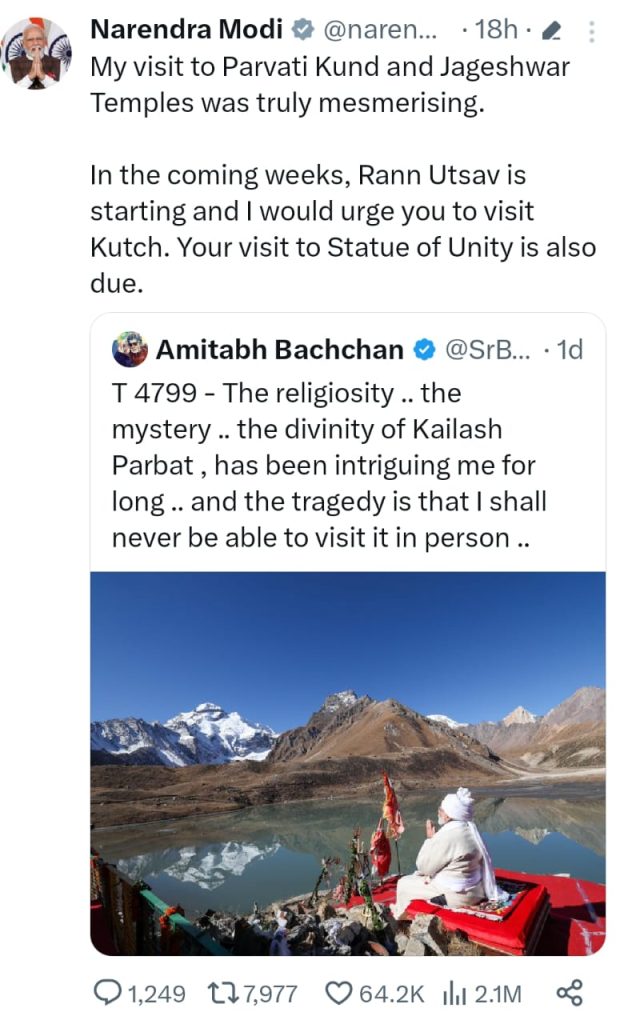 અમિતાભ બચ્ચનના આ ટ્વિટ પછી, પ્રધાનમંત્રી નરેન્દ્ર મોદીએ તેમને એક આમંત્રણ આપ્યું અને લખ્યું, “પાર્વતી કુંડ અને જાગેશ્વર મંદિરની મારી મુલાકાત ખરેખર મંત્રમુગ્ધ કરી દેનારી હતી, આગામી સપ્તાહમાં રણ ઉત્સવ પણ શરૂ થઈ રહ્યો છે. અને હું તમને રણ ઉત્સવમાં આવવા વિનંતી કરું છું. અને સ્ટેચ્યુ ઓફ યુનિટીની તમારી મુલાકાત પણ બાકી છે.”