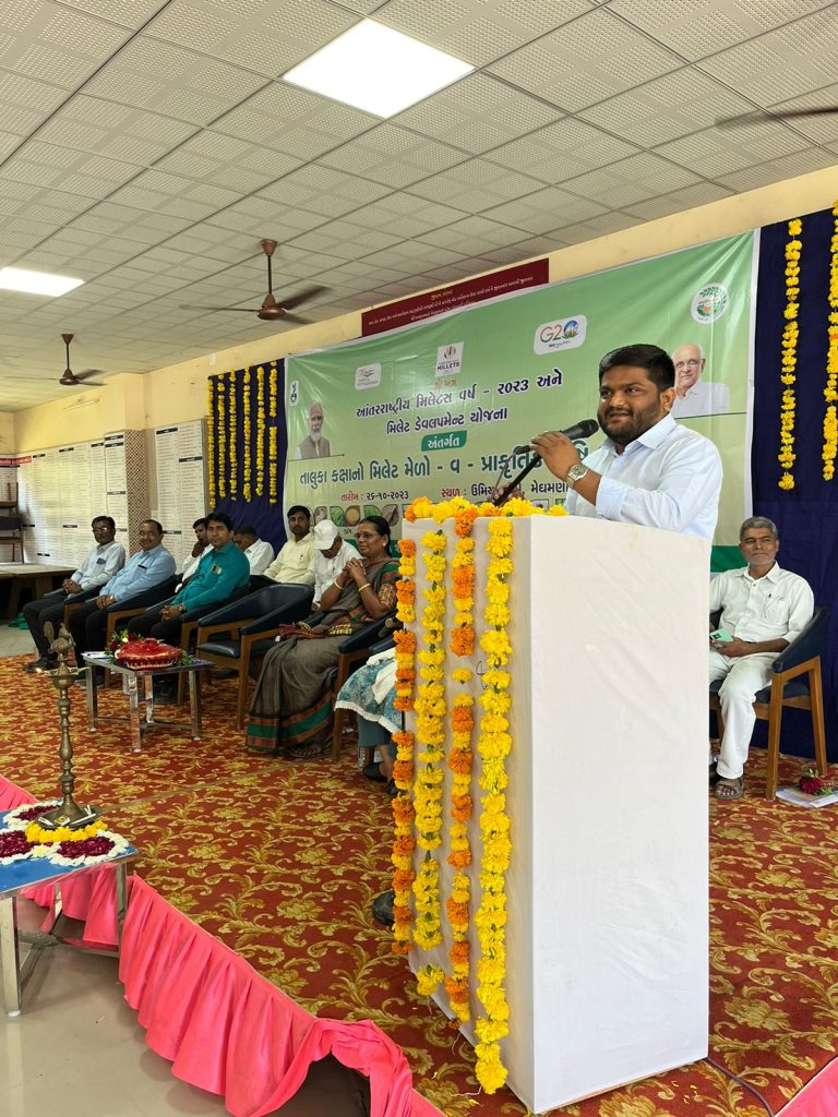 માંડલ સ્થિત ઉમિયાવાડી ખાતે વિરમગામના ધારાસભ્ય શ્રી હાર્દિક પટેલની અધ્યક્ષતામાં આ કાર્યક્રમનું આયોજન કરાયું હતું. આ પ્રસંગે શ્રી હાર્દિક પટેલે પોતાના સંબોધનમાં જણાવ્યું હતું કે, વડાપ્રધાનશ્રી નરેન્દ્રભાઈ મોદીના માર્ગદર્શનમાં વર્ષ ૨૦૨૩ને આંતરરાષ્ટ્રીય તૃણ ધાન્ય વર્ષ તરીકે જાહેર કર્યું છે. શ્રીઅન્નનું વર્ષોથી આપણે વાવેતર કરતા આવ્યા છીએ. ત્યારે મુખ્યમંત્રીશ્રી ભૂપેન્દ્રભાઈ પટેલના નેતૃત્વમાં રાજ્ય સરકાર પણ પ્રાકૃતિક કૃષિ વ્યાપ વધારવા માટે કટિબદ્ધ છે.