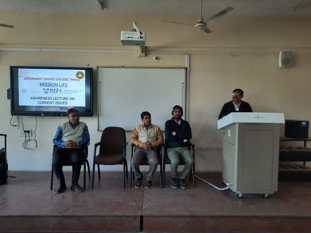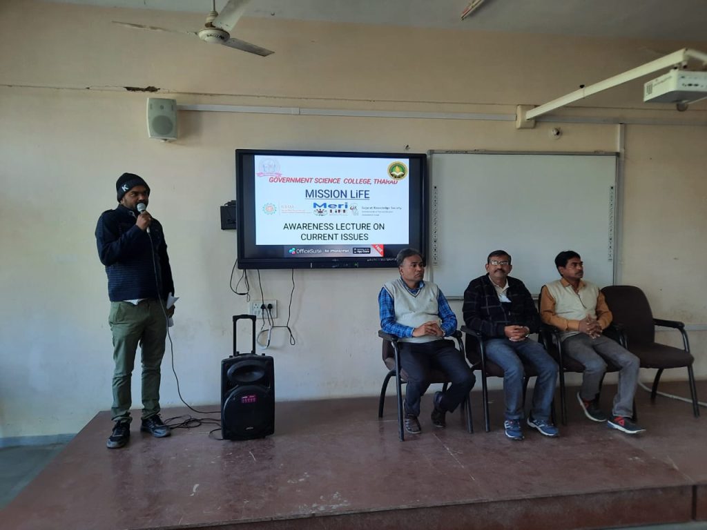 થરાદ પંથકની સરકારી વિજ્ઞાન કોલેજ, થરાદમાં ગુજરાત ઉર્જા વિકાસ એજન્સી (ગેડા) અને ગુજરાત નોલેજ સોસાયટી (GKS) ની પ્રેરણા થકી મિશન લાઈફ બાબતે વિશેષ વ્યાખ્યાનનું આયોજન કરવામાં આવ્યું હતું. વક્તા તરીકે પ્રો ડો નિહાર નિમ્બાર્કે ખુબ જ રસપ્રદ અને માહિતીસભર વ્યાખ્યાન આપ્યુ હતું. જેમાં મોટી સંખ્યામાં વિદ્યાર્થીઓ અને સ્ટાફ જોડાયા હતા.
