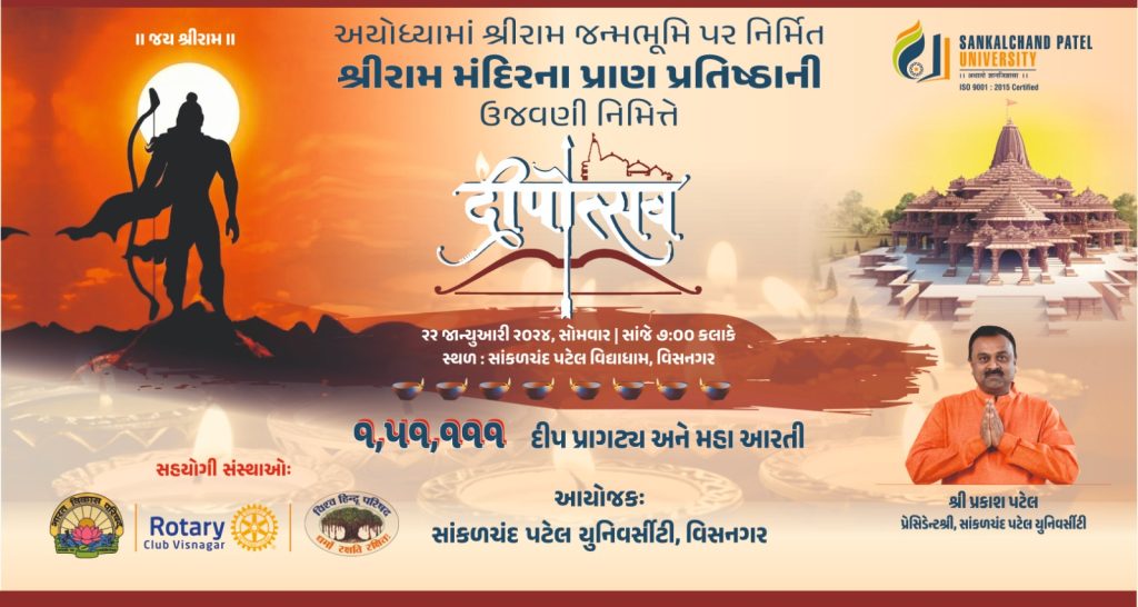 સાંકળચંદ પટેલ યુનિવર્સિટી, વિસનગર દ્વારા આ ઐતિહાસિક પળમાં સહભાગી થવા તારીખ ૨૨ જાન્યુઆરીના દિવસે યુનિવર્સિટી ખાતે ‘દીપોત્સવ’ કાર્યક્રમનું ભવ્ય આયોજન કરવામાં આવ્યું છે. આ કાર્યક્રમમાં યુનિવર્સિટીના વિદ્યાર્થીઓ, સ્ટાફ અને મહેમાનો ખૂબ મોટી સંખ્યામાં ઉપસ્થિત રહી ૧,૫૧,૧૧૧ દીપ પ્રગટાવીને કરવામાં આવશે. નુતન સ્કૂલ તથા યુનિવર્સિટી સંલગ્ન કોલેજોના વિદ્યાર્થીઓ પ્રભુ શ્રીરામના જીવન ચરિત્રની અનુભૂતિ કરાવતી નાટયાવલી રજૂ કરશે. આ ઉપરાંત દેશના જાણીતા અને ખ્યાતનામ કલાકાર અક્ષય પટેલ, ભરત બારીયા અને તેમના ગ્રૂપ ‘નૃત્યાવલી’ દ્વારા વસુધૈવ કુટુંબકમની દિવ્ય મહાઆરતી તથા શ્રીરામ ઉત્સવ નૃત્ય નાટિકા નૃત્યાવલી કાર્યક્રમ રજૂ કરવામાં આવશે. આ સમગ્ર કાર્યક્રમનો મુખ્ય ઉદ્દેશ, વિદ્યાર્થીઓમાં પશ્ચિમી સંસ્કૃતિના વધી રહેલા પ્રભાવને દૂર કરી ભગવાન શ્રીરામના જીવન ચરિત્ર પરથી વડીલો અને ગુરુજન પ્રત્યેની મર્યાદા, સત્યની સાથે સાથે સંયમ શીખવવાનો છે.