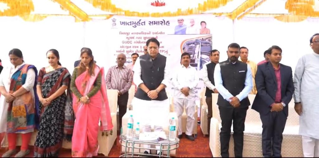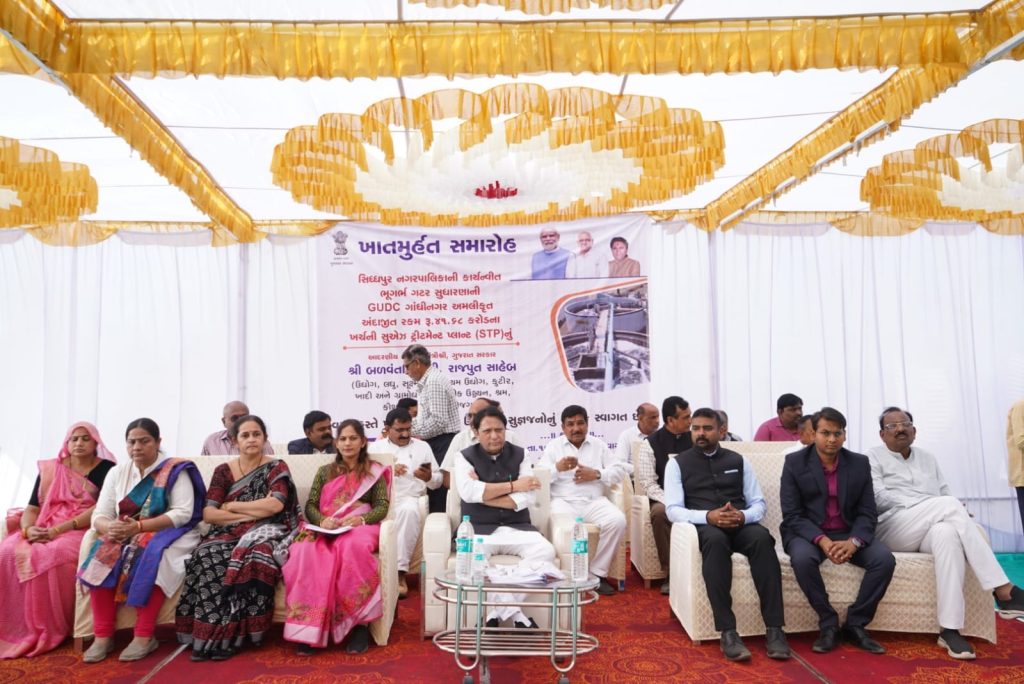 સિદ્ધપુર નગરપાલિકા અને ગુજરાત શહેરી વિકાસ કંપની, ગાંધીનગર ના સંયુક્ત ઉપક્રમે રૂ. ૪૧.૬૮ કરોડના ખર્ચ થી તૈયાર થનાર સુએઝ ટ્રીટમેન્ટ પ્લાન્ટનું ખાતમુહૂર્ત કર્યુ. સુએઝ ટ્રીટમેન્ટ પ્લાન્ટ થી સિધ્ધપુર શહેરની અને વિકસીત વિસ્તારની ઉભરાતી ગટરના પ્રશ્ન હલ થશે. આ પ્રોજેકટથી શુધ્ધીકરણ બાદનાં પાણીનાં પુનઃ વપરાશ માટેની તકો ઉભી કરી શકાશે, જેના કારણે એન્વાયરમેન્ટ ફ્રેન્ડલી વાતાવરણ બનશે. વડોદરા દુર્ઘટનાના દિવંગતોના આત્માની શાંતિ માટે કાર્યકમ પૂર્વ 2 મિનિટનું મોન પાળી શ્રદ્ધા સુમન અર્પણ કર્યા હતા.