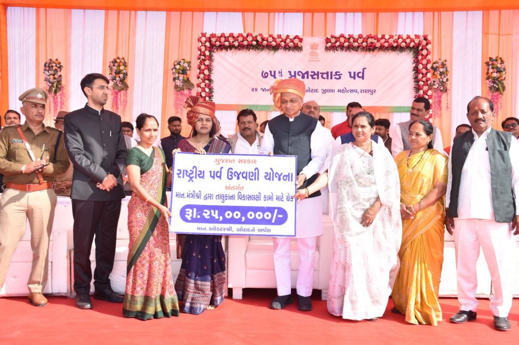 આ પ્રસંગે કેબિનેટ મંત્રીશ્રી કુંવરજીભાઇ બાવળીયાએ ઉર્જાવાન પ્રવચન કરતા જણાવ્યુ હતું કે, “સમગ્ર દેશમાં ૭૫મા પ્રજાસત્તાક પર્વની આનંદ અને ઉલ્લાસભેર ઉજવણી કરવામાં આવી રહી છે, ત્યારે બોટાદ જિલ્લાના નાગરિકોને હું પ્રજાસત્તાક પર્વ નિમિત્તે હાર્દિક અભિનંદન પાઠવું છું. આજના આ અનેરા અવસરે બોટાદ જિલ્લાના રાણપુરના આંગણે પ્રજાસત્તાક પર્વની ઉજવણી પ્રસંગે રાષ્ટ્રધ્વજ લહેરાવતા હું આનંદની લાગણી અનુભવું છું. તાજેતરમાં આખુ ભારત રામના આદર્શ અને રામના કાર્યોને હર્ષોલ્લાસ સાથે વધાવી દેશના જન-જન શ્રી રામના જયઘોષ સાથે સંતુષ્ટી વ્યક્ત કરતા જોવા મળ્યા હતા. આપણા યશસ્વી પ્રધાનમંત્રી શ્રી નરેન્દ્રભાઇ મોદીના શબ્દોમાં જ કહું તો, ‘રામ એક ઊર્જા છે, રામ રૂપે રાષ્ટ્ર ચેતનાનુ મંદિર, રામ ભારતની પ્રતિષ્ઠા અને પ્રતાપ છે. પ્રધાનમંત્રી શ્રી નરેન્દ્રભાઈ મોદીએ આપેલા વિકાસમંત્રને આપણે સત્યનિષ્ઠાપૂર્વક લઈને ચાલી રહ્યા છીએ. તેથી જ, ‘એક ભારત, એક રાષ્ટ્રના’ સંકલ્પ સાથે આપણા ભારતે અસામાન્ય સિદ્ધિઓ હાંસલ કરી છે.