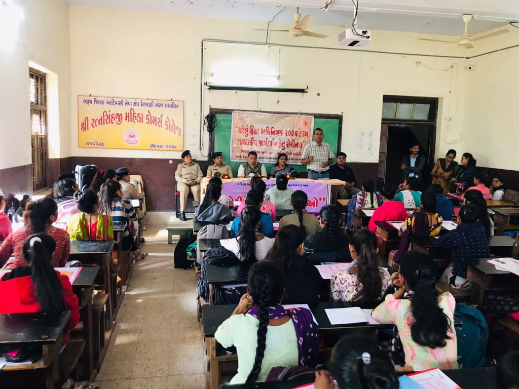 રાજપીપલા, – નર્મદા જિલ્લા મહિલા અને બાળ વિકાસ વિભાગ દ્વારા શ્રી રત્નસિંહજી મહીડા કોમર્સ કોલેજ રાજપીપલા ખાતે ‘ઘરેલુ હિંસા અધિનિયમ 2005 અંતર્ગત કાયદાકીય જાગૃતિ શિબિરનું આયોજન કરવામાં આવ્યું હતું.