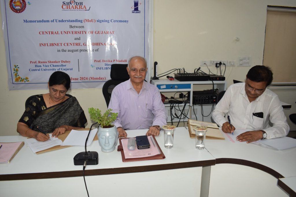 ગાંધીનગર. સેન્ટ્રલ યુનિવર્સિટી ઓફ ગુજરાતે (CUG) સેન્ટર ફોર ઇન્ફોર્મેશન એન્ડ લાઇબ્રેરી નેટવર્ક (INFLIBNET), ગાંધીનગર સાથે શોધ ચક્ર પર સમજૂતી કરાર (એમઓયુ) પર હસ્તાક્ષર કર્યા છે. એમઓયુ દરમિયાન, INFLIBNET સેન્ટર, ગાંધીનગરના નિયામક પ્રો. દેવિકા પી મદલ્લી અને સીયુજીના વાઇસ ચાન્સેલર પ્રો. રમાશંકર દુબે ઉપસ્થિત રહ્યા હતા. પ્રો. મદલ્લીએ જણાવ્યું હતું કે સંશોધન કાર્યને પ્રોત્સાહન આપવા માટે UGCએ ઓનલાઇન પ્લેટફોર્મ રિસર્ચ ચક્ર શરૂ કર્યું છે. સંશોધકો અને સંશોધન નિરીક્ષકો માટે શોધ ચક્ર પર પૂરતી સામગ્રી ઉપલબ્ધ છે. તેમણે કહ્યું કે અત્યાર સુધી એવું કોઈ સમર્પિત પ્લેટફોર્મ નહોતું કે જ્યાં સંશોધનના વિવિધ ક્ષેત્રોને લગતી સંપૂર્ણ વિગતો ઉપલબ્ધ હોય. હવે શોધ ચક્રની મદદથી સંશોધકો વધુ સારા સંશોધન માટે પ્રેરિત થશે. આ દરમિયાન સીયુજીના રજીસ્ટ્રાર પ્રો. એચ.બી.પટેલ અને INFLIBNETના ડાયરેક્ટર પ્રો. મદલ્લીએ એમઓયુ પર હસ્તાક્ષર કર્યા. કાર્યક્રમના અધ્યક્ષસ્થાનેથી યુનિવર્સિટીના કુલપતિ પ્રો. રમાશંકર દુબેએ કહ્યું કે હવે શોધ ચક્ર દ્વારા સંશોધકોની પ્રગતિ પર પણ નજર રાખવામાં આવશે. સંશોધનને પારદર્શક અને સરળ બનાવવાની દિશામાં આ એક ઉત્તમ પગલું સાબિત થશે. યુનિવર્સિટીની સેન્ટ્રલ લાઈબ્રેરીના ઈન્ચાર્જ પ્રોફેસર પ્રો. ભાવના પાઠકે જણાવ્યું હતું કે ટૂંક સમયમાં યુનિવર્સિટી લાઇબ્રેરીમાં એક INFLIBNET રિસર્ચ કોર્નર બનાવવામાં આવશે જેથી સંશોધકોને તેમની સંશોધન સંબંધિત સમસ્યાઓના ઝડપથી ઉકેલ મળી શકે.
