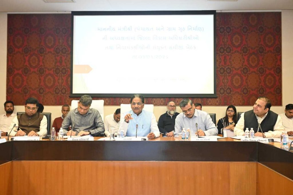 ગુજરાતના પંચાયત અને ગ્રામ ગૃહ નિર્માણ મંત્રી શ્રી ઋષિકેશભાઈ પટેલની અધ્યક્ષતામાં આજે ગાંધીનગર ખાતે રાજ્યના તમામ જિલ્લા વિકાસ અધિકારીશ્રીઓ (DDO) અને નિયામકશ્રીઓની એક મહત્વપૂર્ણ સમીક્ષા બેઠક યોજાઈ હતી. આ બેઠકમાં પંચાયત મંત્રીશ્રી તેમજ પંચાયત, ગ્રામ વિકાસ અને ગ્રામ ગૃહ નિર્માણ વિભાગના અગ્ર સચિવ શ્રી ધનંજય દ્વિવેદીએ ગ્રામીણ સ્તરે ચાલી રહેલી વિવિધ વિકાસલક્ષી યોજનાઓની પ્રગતિની સમીક્ષા કરી તેને વેગ આપવા માટે જરૂરી માર્ગદર્શન આપ્યું હતું.