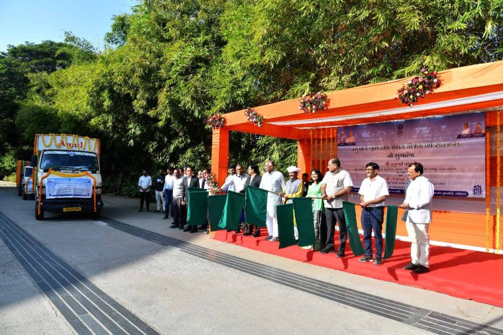 વધુમાં, મંત્રીશ્રી સહિતના મહાનુભાવોના હસ્તે પશુપાલન વિભાગની વિવિધ કલ્યાણકારી યોજનાઓના લાભાર્થીઓને સહાય તેમજ મંજૂરી હુકમોનું વિતરણ કરવામાં આવ્યું હતું. તદુપરાંત, મંત્રીશ્રીએ રૂ. ૭.૨૪ કરોડના ખર્ચે નવનિર્મિત પશુ દવાખાનાઓ અને પ્રાથમિક પશુ સારવાર કેન્દ્રોનું ઈ-લોકાર્પણ કર્યું હતું. કાર્યક્રમના અંતે ‘દાણ સહાય યોજના’ હેઠળ રાજ્યમાં ગાભણ-વિયાણ થયેલા પશુઓ માટે દાણ ભરેલા વાહનોને લીલી ઝંડી આપીને મંત્રીશ્રી સહિતના મહાનુભાવોએ દાણ વિતરણનો પ્રારંભ કરાવ્યો હતો.